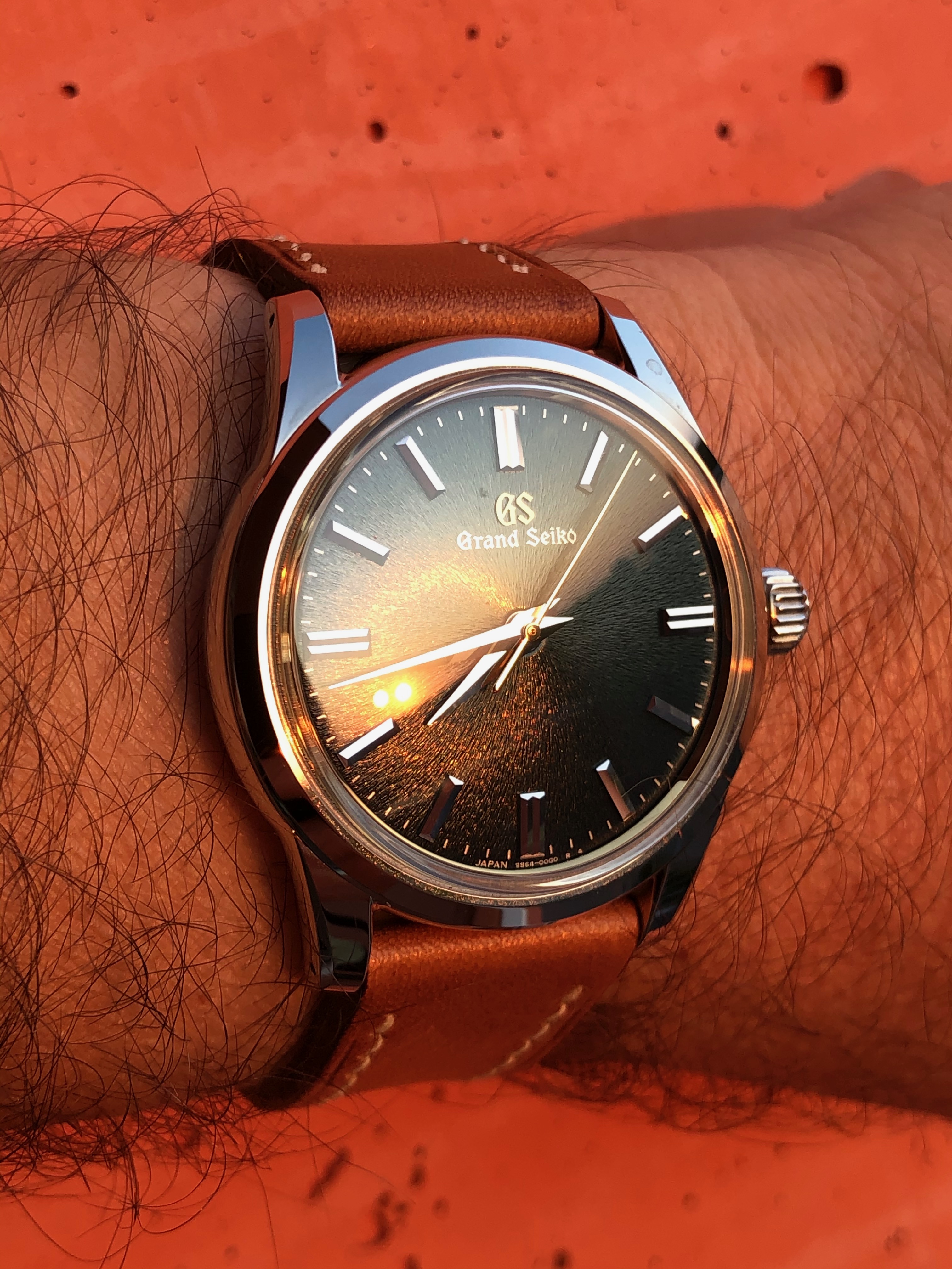 The silk sunray dial of the Grand Seiko SBGA373 is one of the unspoken heroes of the collection. It’s a very, very delicate, light sunray unlike anything you would find anywhere else. There are many layers to this dial, which actually makes it more complex than making the dial on the Grand Seiko SBGA211 Snowflake. The whole goal, as with all components of a Grand Seiko watch, is to play with light and shadow. You take this dial into the sun, and it’s silver in tone. Then you get into a darker setting, and it becomes a radiant champagne gold. The rest of the time, it’s somewhere in between. It’s really a complex dial.