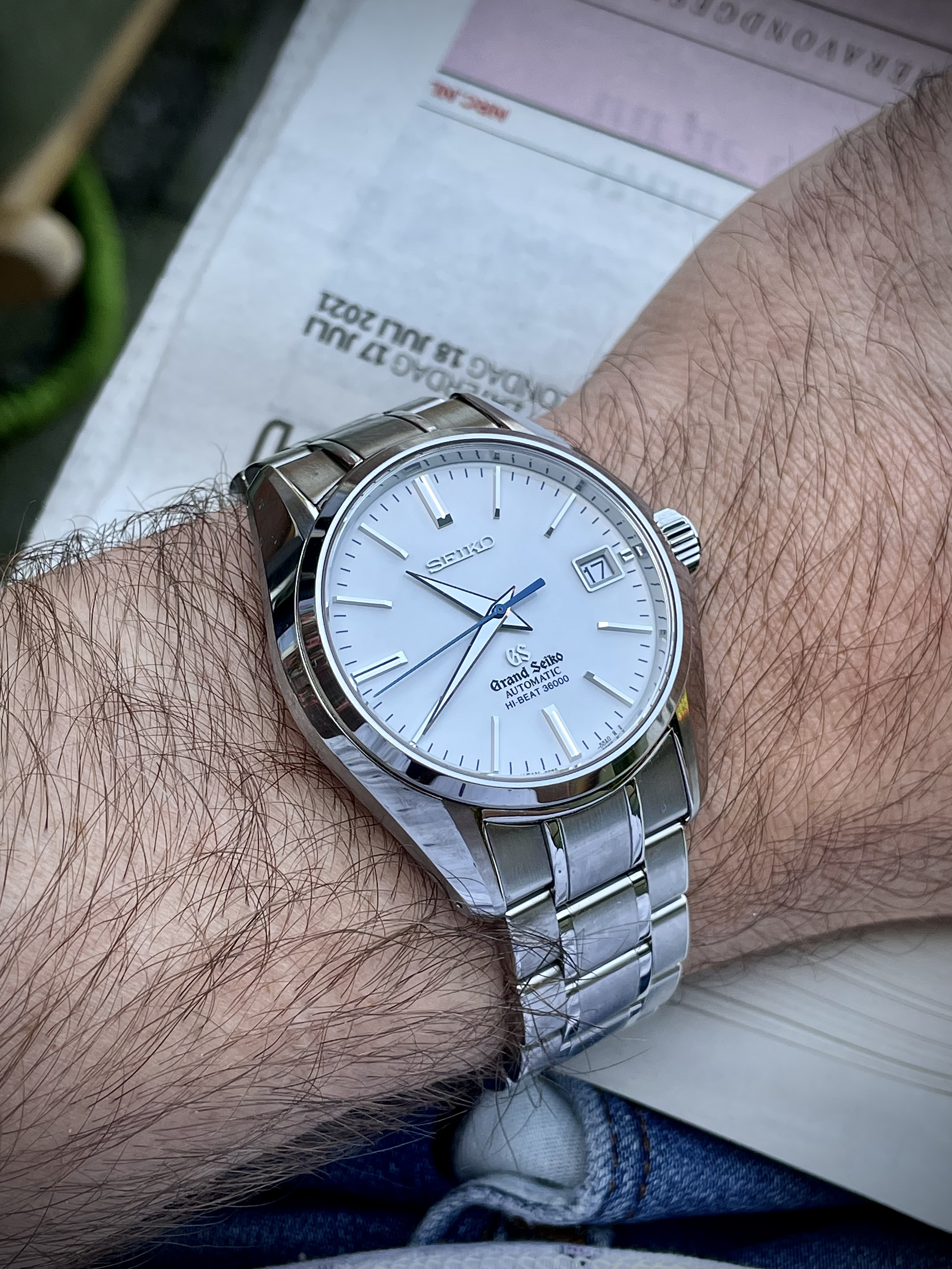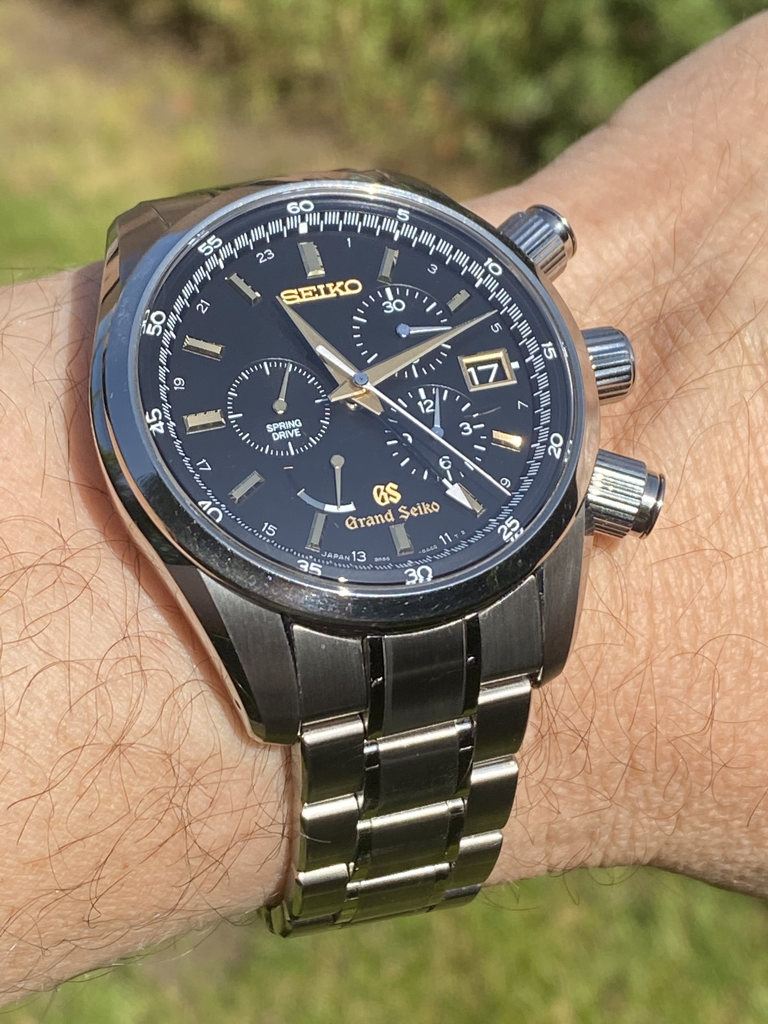 Dezelfde 44GS maar door de dunne Quartz kast valt hij veel subtieler op de pols, althans dat vond ik toen ik hem naast de spring drive versie hield… Lijkt meer op hoe de oorspronkelijke 44GS valt. Dit is de SBGP005!