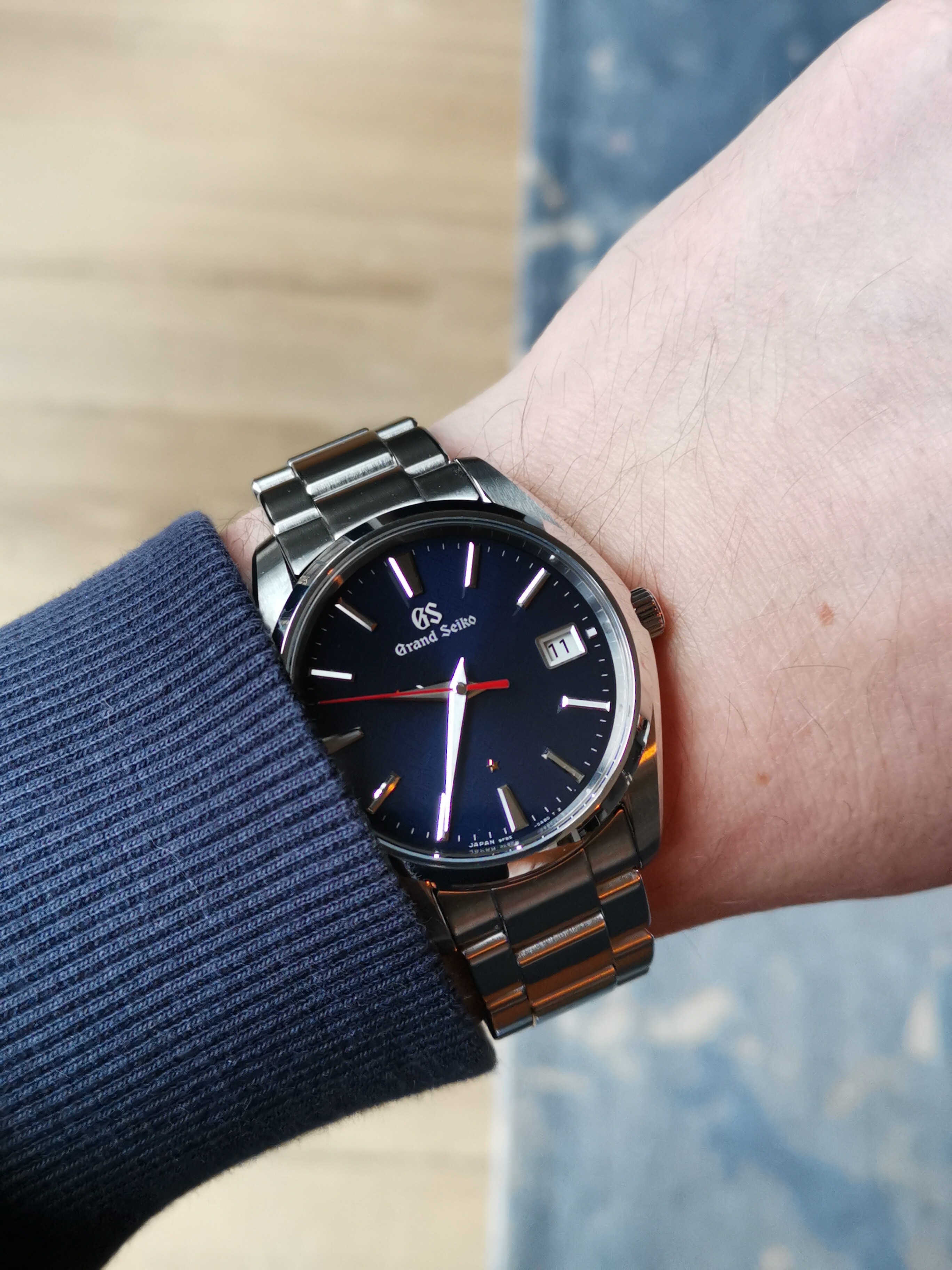 Het meest opvallende verschil tussen de high beat SLGH005 en de spring drive SLGA009 is het randje tussen de bezel en de band. Bij de SLGH005 (en ook de SLGH003 hierboven) loopt de bezel totaan aan band. Bij de SLAG009 duidelijk niet. Ik zou denken dat ze alle CAD tekeningen gewoon ctrl-C ctrl-V gedaan hadden en alleen het uurwerk en wijzerplaat aangepast zouden hebben. Maar de kasten lijken niet uitwisselbaar. Op foto’s uit andere hoeken zie je het ook duidelijk.