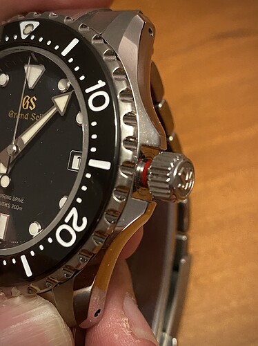 Dat de kroon uit staat valt je denk ik meer op dan de rode cirkel, maar goed, hij zal ervoor bedoeld zijn denk ik. Een leuke kleine extra feature. Misschien dat andere (Grand) Seiko duikers dit ook hebben, maar het is mij nog niet eerder ergens opgevallen.