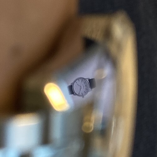 Ik heb mijn iphone focus op de juiste afstand weten te zetten, en richt mijn SBGA105 dan zo dat de weerspiegeling van een horlogeafbeelding op mijn computerscherm goed op de lug valt en neem dan een foto. Dat doe je door je iphone op de juiste afstand op het scherm te richten en dan een paar seconden op ongeveer het midden ingedrukt te houden. Dan schakelt hij naar AF/AE lock en dan dan blijft de afstand en belichting staan. En dan maar proberen je arm en cam juist te positioneren en af te drukken