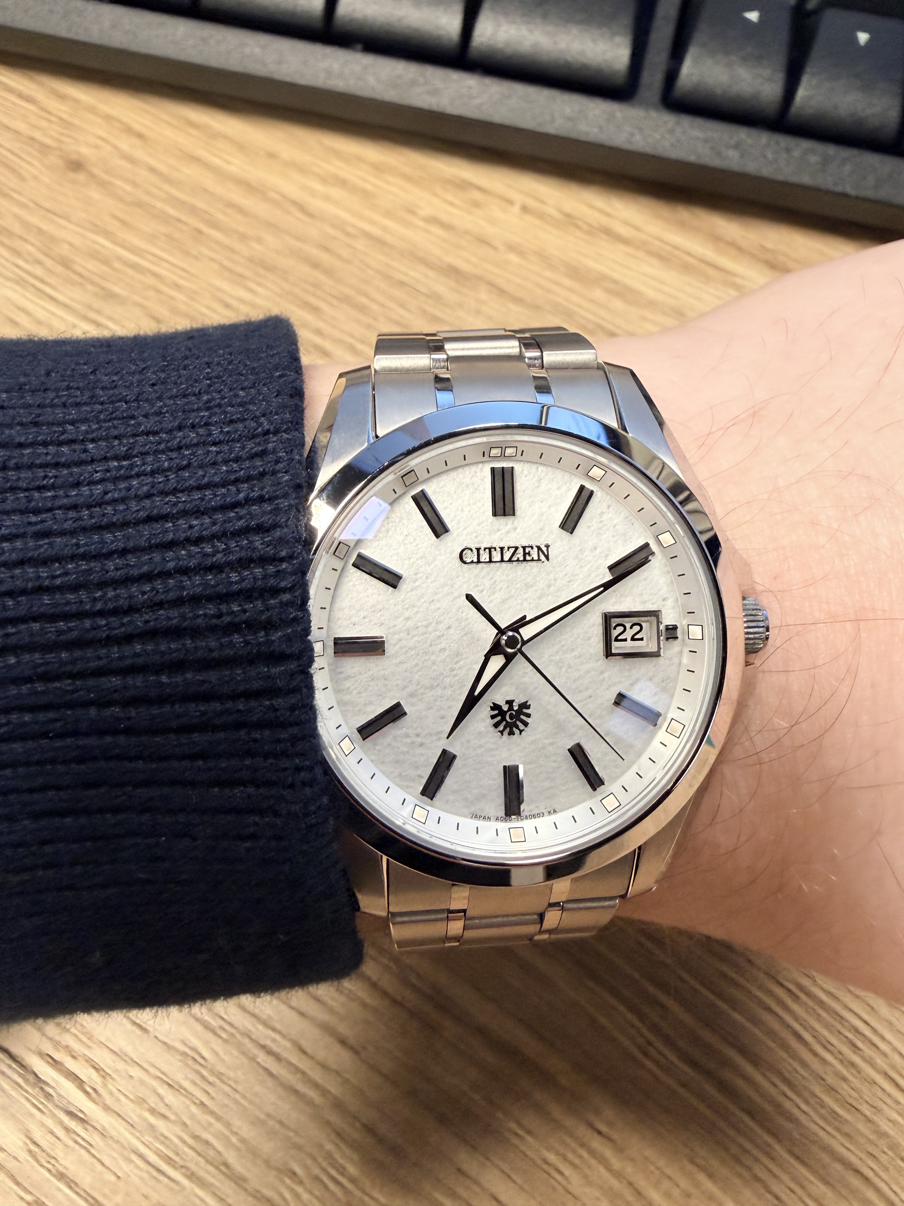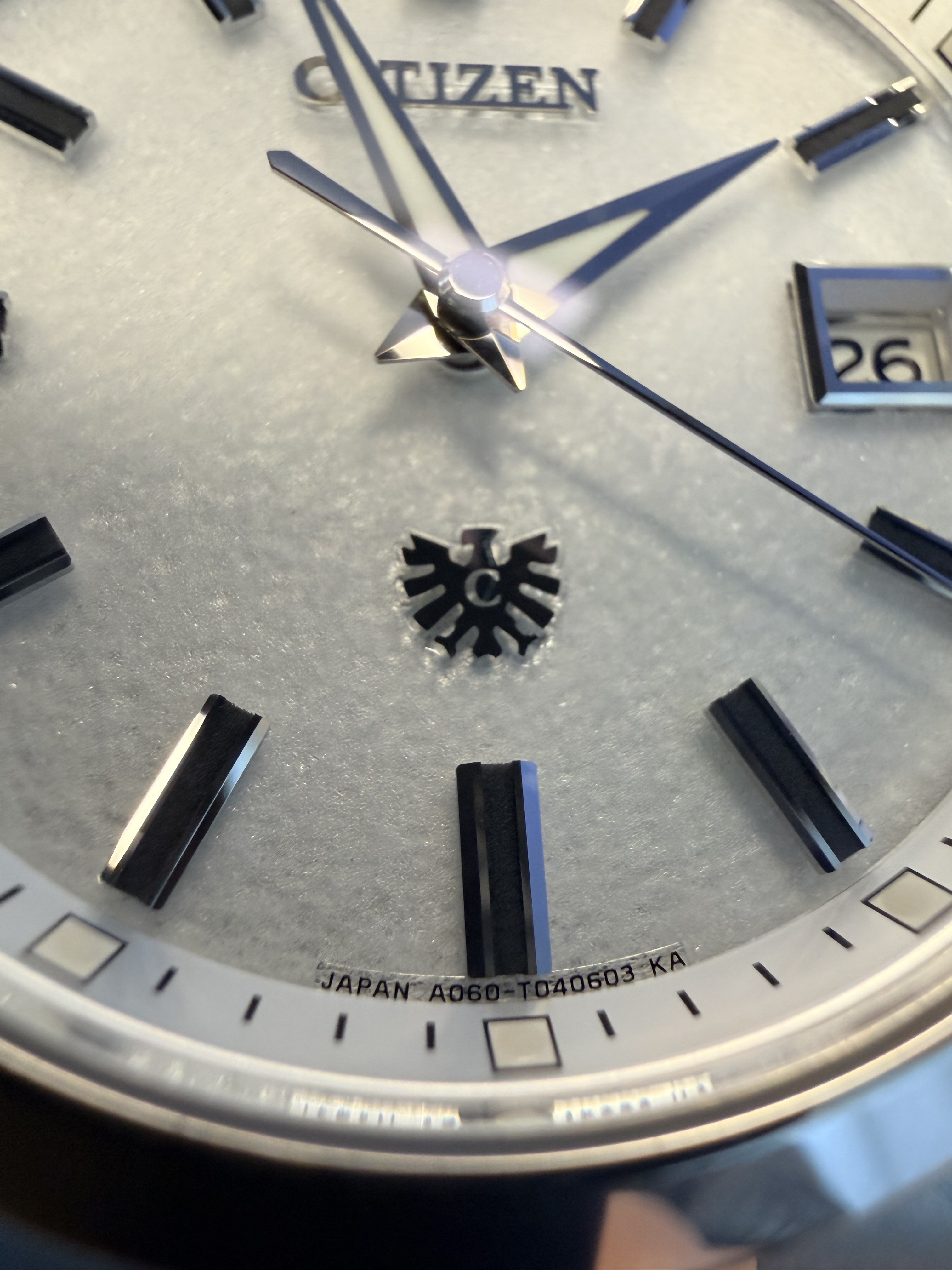The AQ4100-22A is a model expressing the magical moment when dawn gently breaks in mid-winter and the rising sun gradually illuminates the freshly fallen snow covering the landscape. It features a Tosa washi dial with platinum leaf applied by hand using a traditional Japanese decorative technique called Sunago-maki, where fine platinum leaf powder is sprinkled on the surface of the paper like snow. A gray gradient provides the element of nijimi, capturing the harsh beauty of the winter scenery. The gray second hand is reminiscent of charcoal, burned to combat the harsh winter cold, and provides a striking accent.