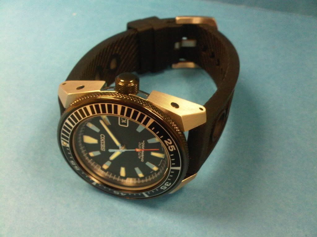 Die Samurai is heel mooi. Alleen jammer van die (vind ik) lelijke band. Op zo’n ding hoort gewoon een lederen band als je de TI-band wilt sparen. Een Samurai is de enige Seiko Scuba die er modieus uitziet op een lederen band: