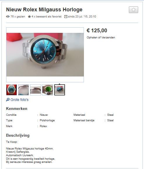 Ik neem aan dat je als koper wel weet dat je voor €125 geen echte Rolex krijgt. Zoals gezegd, heel marktplaats staat er vol mee. Net als alle souvenirshops in welke willekeurige vakantiebestemming dan ook. Dus wat probeer je te zeggen?