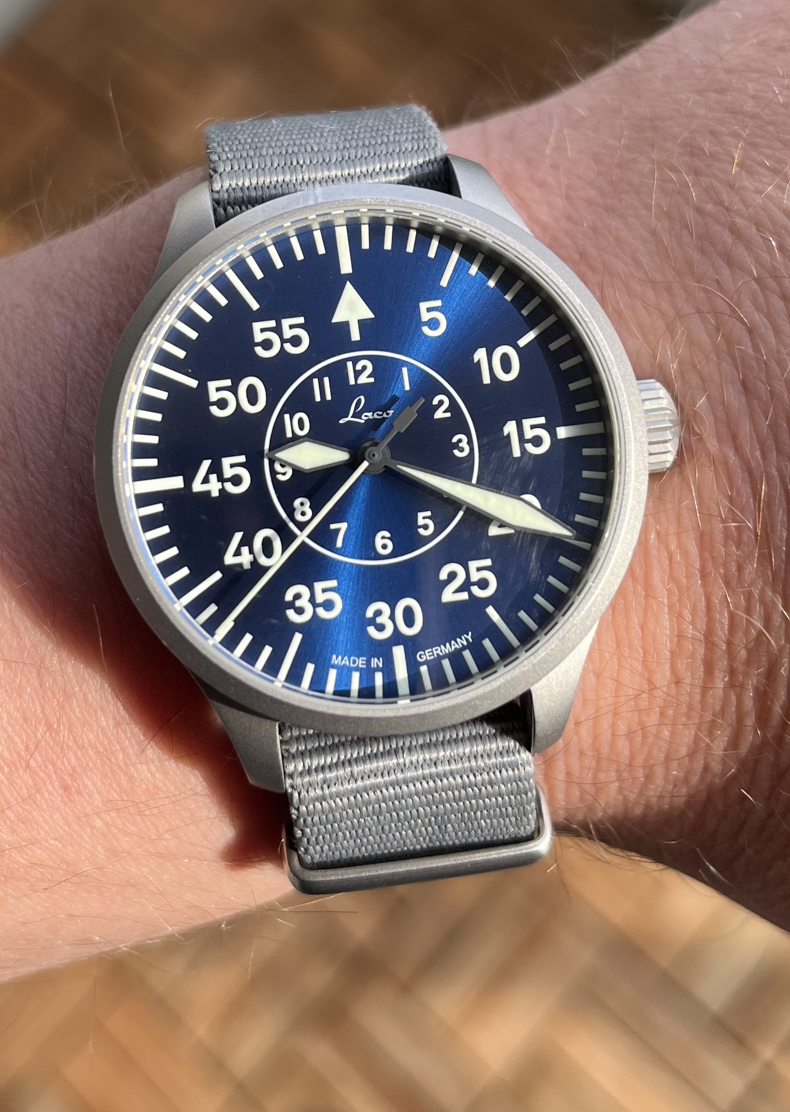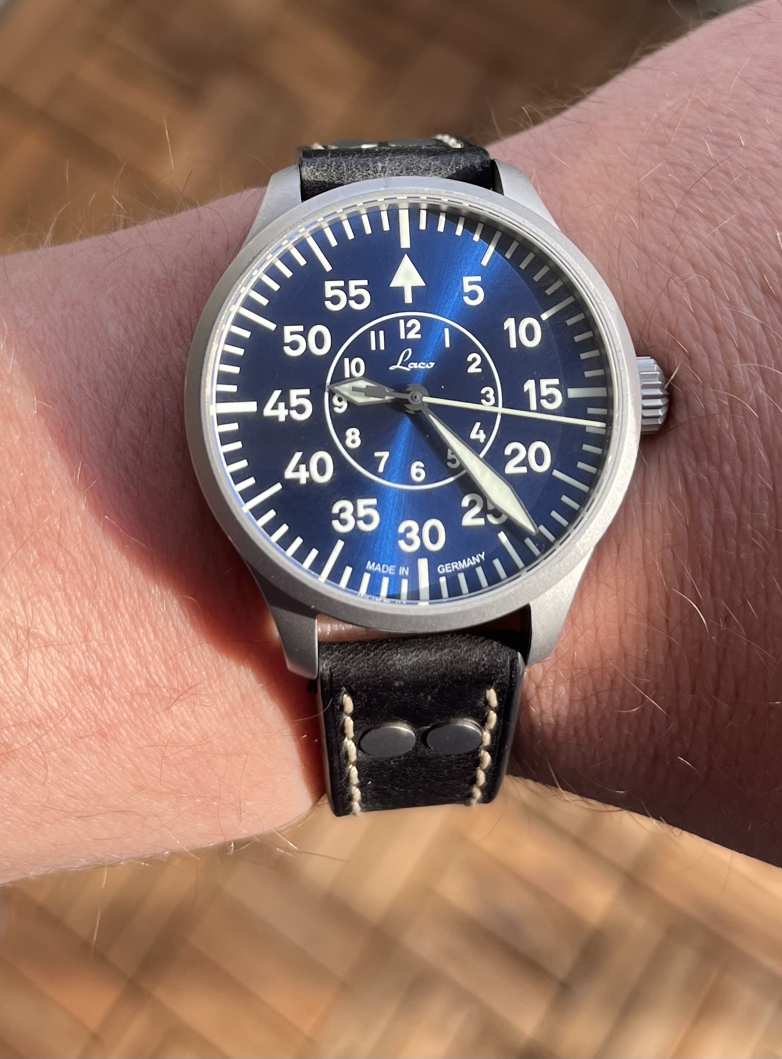 Originele doos en/of eventuele accessoires:jcompleet met 2 extra banden een originele Laco NATO Strap en een zwarte pilot band o origineel laco