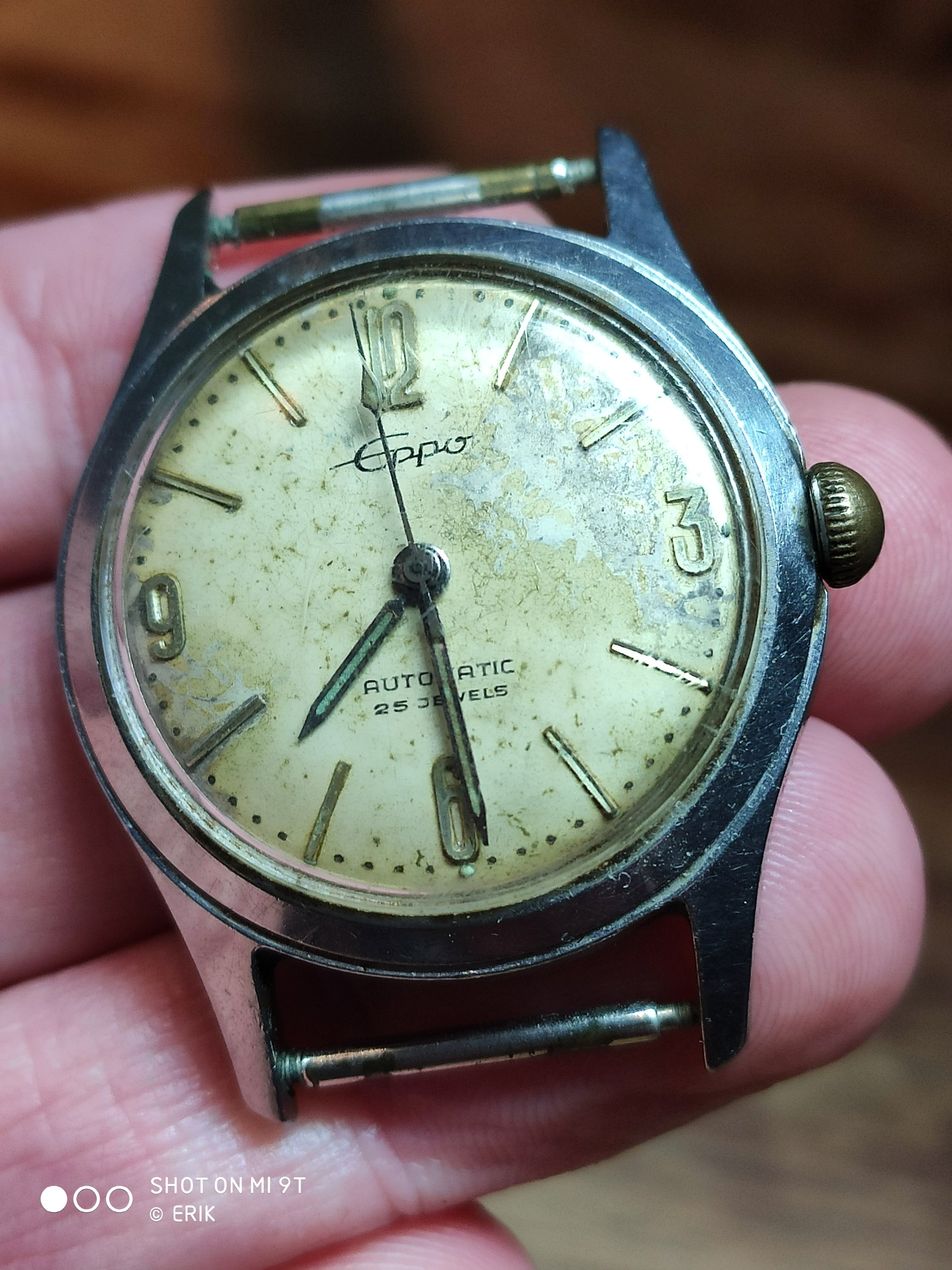 Het merk Eppo kende ik niet zo en het Otero 844 caliber dat er in zat, had ik ook nog niet eerder gezien. Mikrolisk vertelde mij dat Eppo een merk was van “Eppo-Uhrenfabrik - Otto Epple - Epple & Co.- Königsbach und Pforzheim, Deutschland; registriert am 12.7.1956”