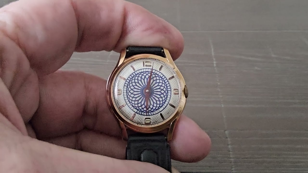 Dit horloge heeft een leuke surprise zoals de naam van het horloge al doet vermoeden nl. een leuk optisch schouwspel dat vooral bekend geworden is door de horloges van Ernest Borel, echter…die draait met de klok mee en de veranderende figuur van deze Lanco draait tegen de wijzers van de klok in.
