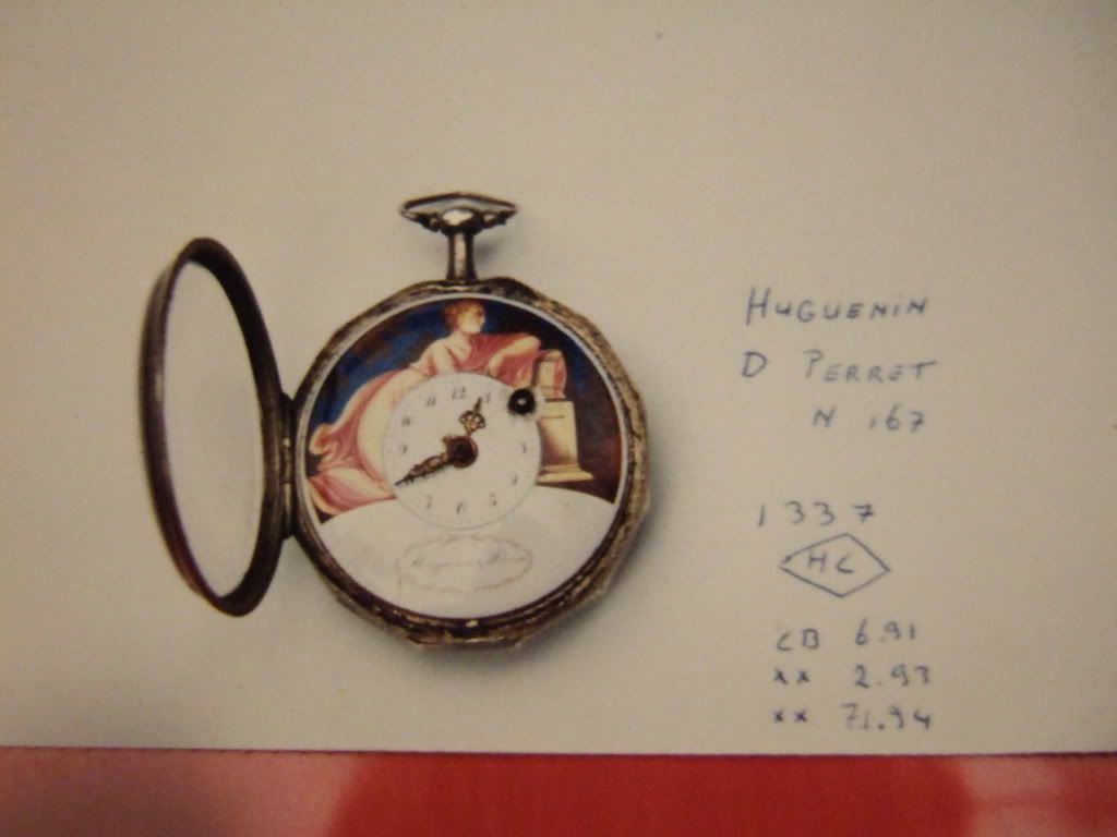 Laat ik eens een poging wagen. De familie Huguenin (de naam gaat terug tot de veertiende eeuw en duikt vooral op in Neuchâtel en Le Locle) behoort tot de oudste horlogefamilies die Zwitserland rijk is. Binnen deze families waren onderlinge huwelijken gebruikelijk en we zien dan ook regelmatig namen als Brandt, Courvoisier, Dubois, Perrelet, Piaget en Sandoz in de familienaam opduiken, Een aantal Huguenins heeft de toekomst in Amerika gezocht, o.a. resulterend in - jawel - deze site http://www.hugueninusa.com/