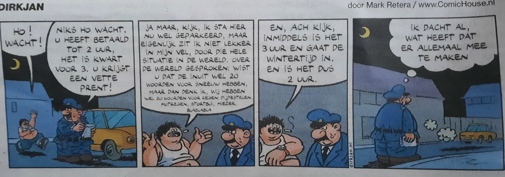 Ik vind het nog steeds wonderlijk (aan mezelf) dat ik met mijn veertig lentes nog steeds élke keer moet nadenken: wordt ‘t dan vroeger, of later, en moet ik dan voor mijn gevoel vroeger, of later op? El-ke keer.