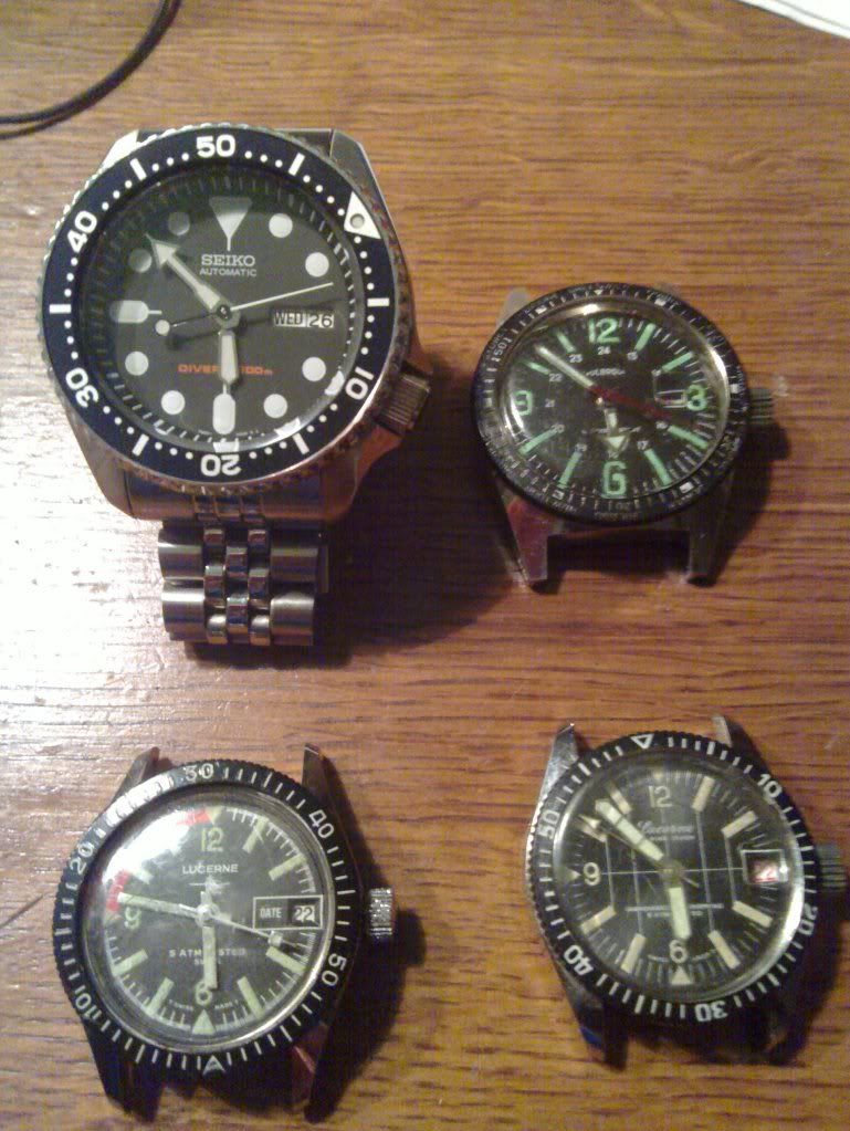 Hier heb ik mijn SKX007 er bij gezet, best wel leuk om te zien hoe klein de andere horloges zijn ( of hoe groot de Seiko ) De seiko is 42.5 mm de andere horloges respectievelijk 35, 32 en 30 mm