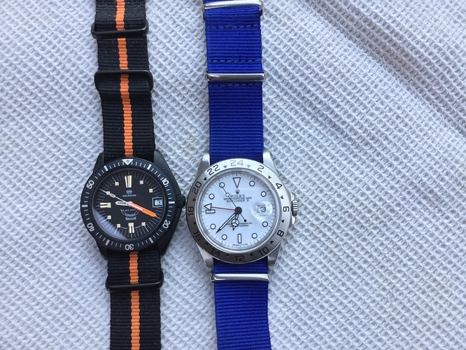 Een - relatief dunne - Explorer II op nato zou nog kunnen, maar zo’n dikke Dweller op zo’n iel dun nato bandje is imo spuuglelijk.
