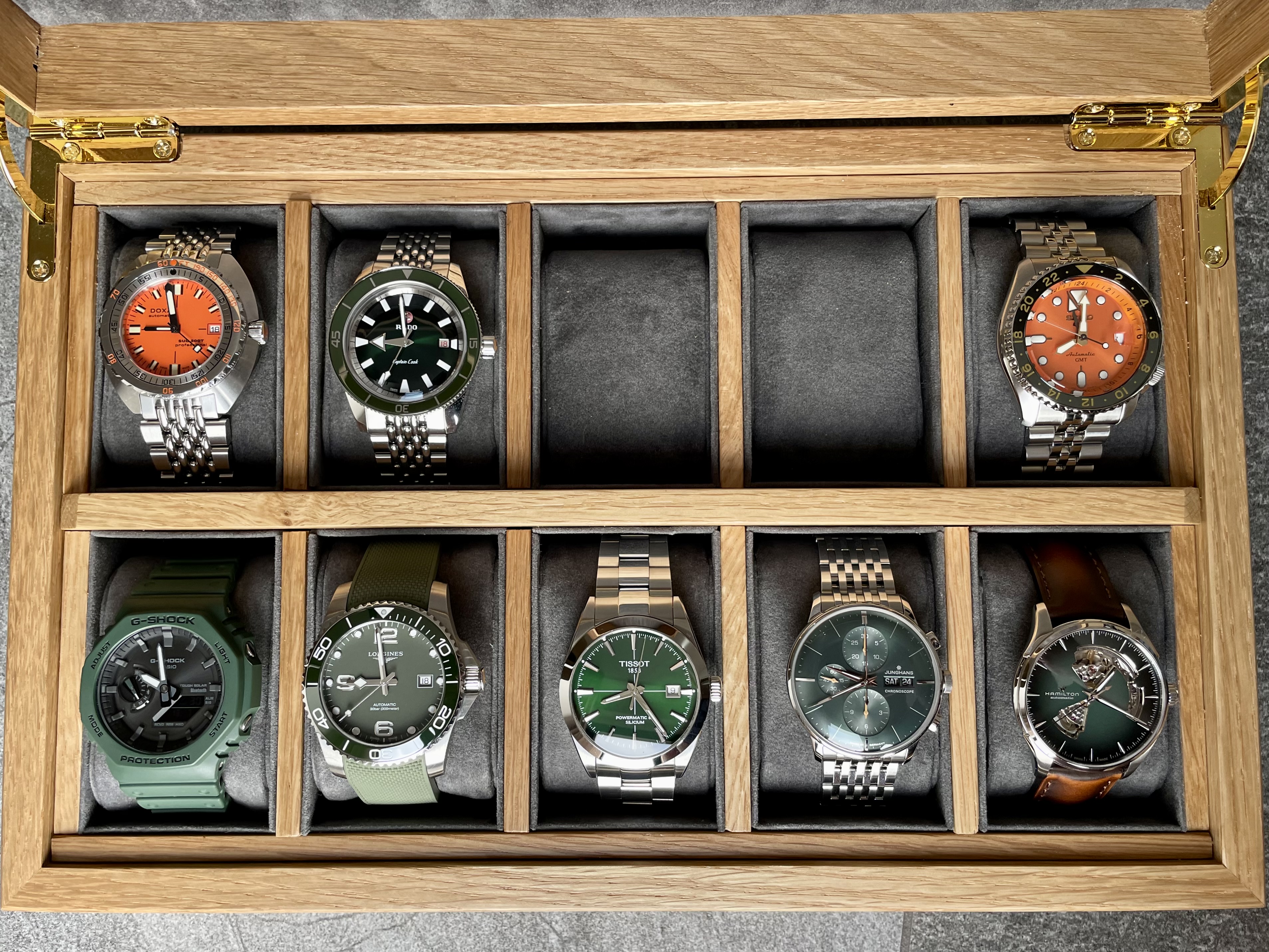 Mijn verzameling bestaat uit groene horloges , waarbij ik enige merkgeschiedenis een waardevolle toevoeging vind bij de overwegingen. Ook heb ik een sterke voorkeur voor een horloge per merk en een goede spreiding passend bij mij levensstijl. Op iedere regel natuurlijk een uitzondering .