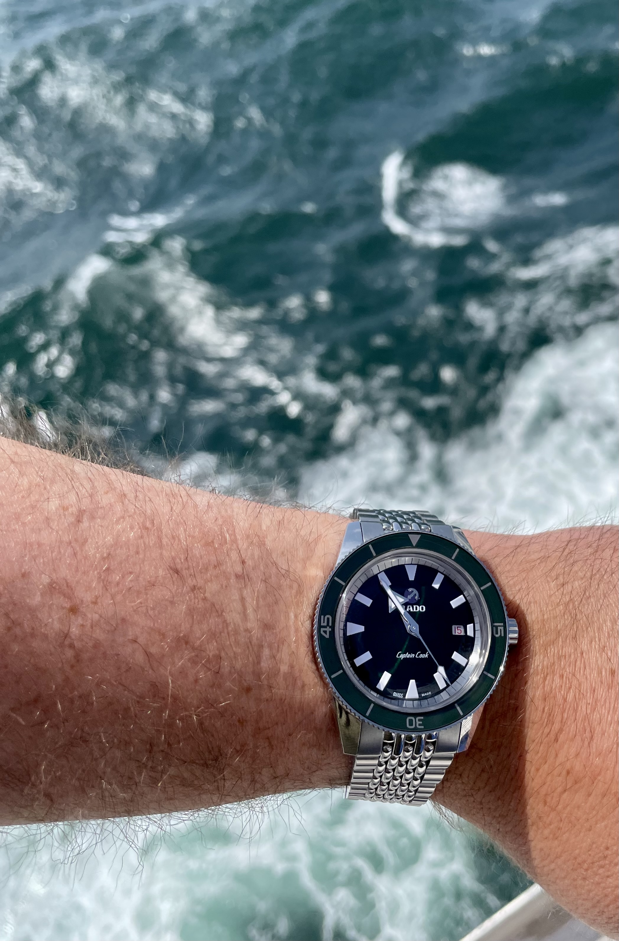 Ontzettend goed, ik vind de style van de Junghans Meister collectie sowieso erg mooi. Het ‘echte’ strakke design past niet zo goed bij mijn dagelijkse stijl, maar deze chrono maakt het voor mij beter te dragen. De kleur is heel erg gaaf in het licht, ook omdat er een hele dikke bubbel saffierglas overheen zit waardoor alles vervormt/schittert in verschillende hoeken.