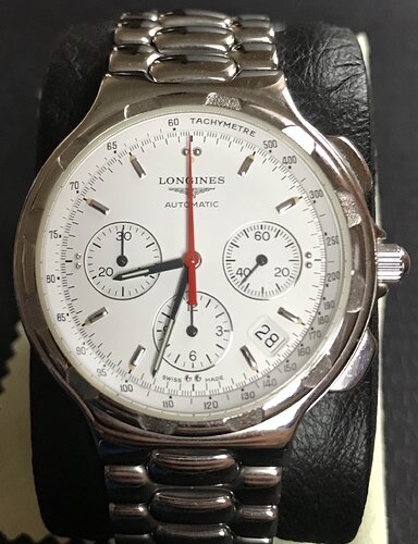 Hoi nieuw op dit forum maar ook weer niet. Ik volg het al een lange tijd. En vroeger ook wel eens gepost. Ik heb even een vraag ik heb een Longines Conquest chrono in de kast liggen type nummer L 1.623.4. 20 jaar geleden een keer bij een juwelier gekocht maar ik heb hem nagenoeg nooit gedragen. Ik vond hem na “vergeten” te zijn weer terug onder in een “rommel” lade. Ik dacht laat ik eens googelen op dit model. Maar ik kom hem gewoon “nergens” tegen op het internet?! Iemand bekend met dit model? Ik zie nu pas dat de tachymeter ring niet goed uitgelijnd staat. Lekker kwaliteitscontrole indertijd bij Longines