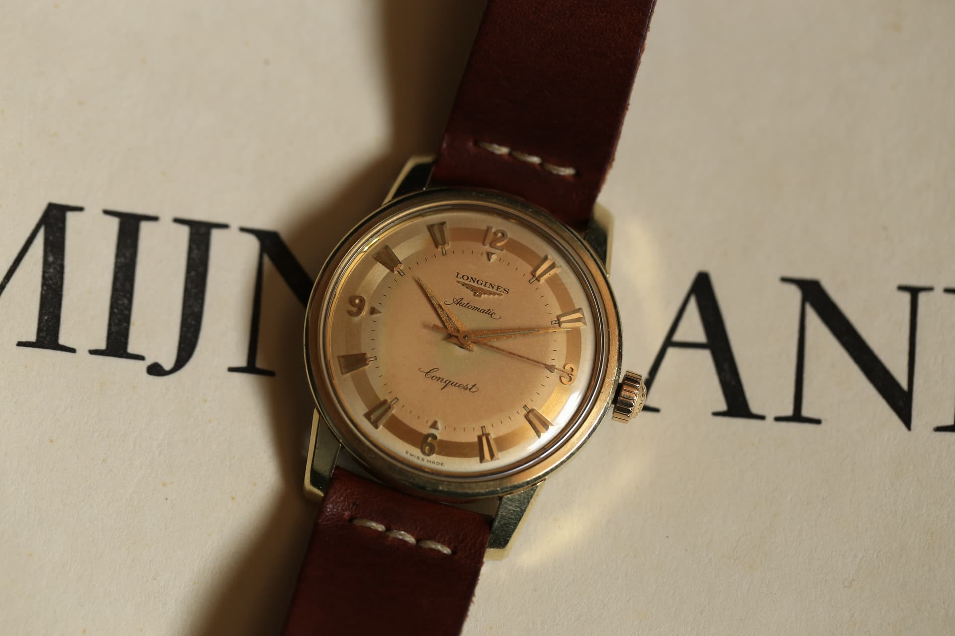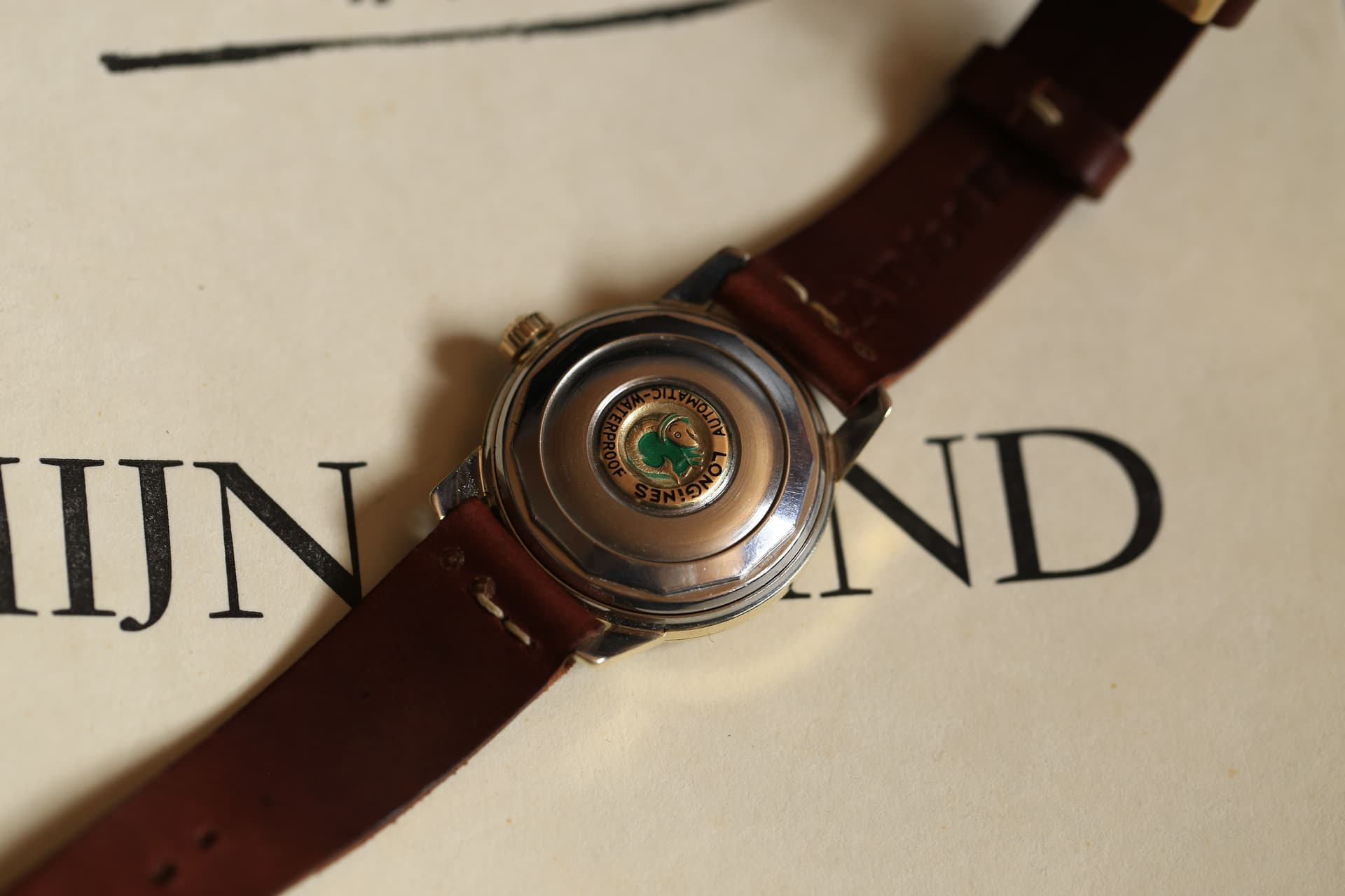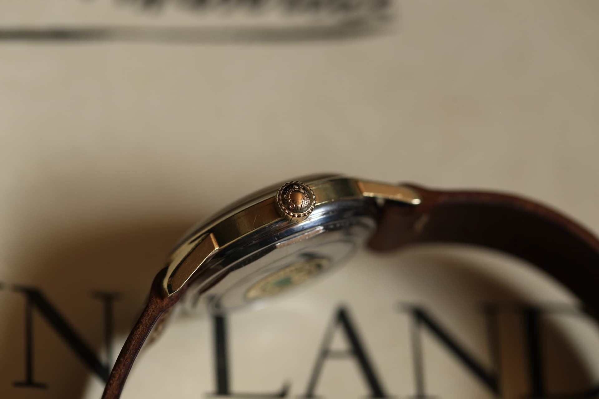 Ik heb het horloge zelf aangekocht als projectstuk van de eerste eigenaar. Helaas heb ik te veel andere horloges en draag ik hem te weinig. Het draagt zichtbare gebruikssporen, maar dat is niet abnormaal voor een horloge van 70 jaar oud. Het horloge is goldcapped en zeer kwaliteitsvol gemaakt. Het bandje krijgt u er bij.
