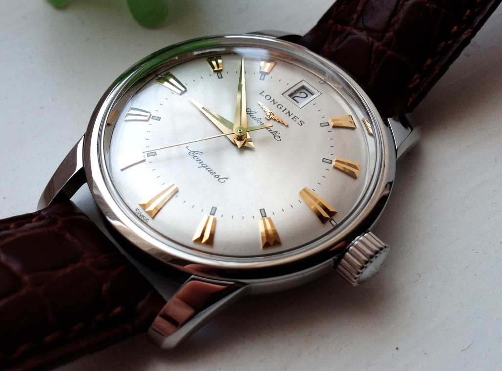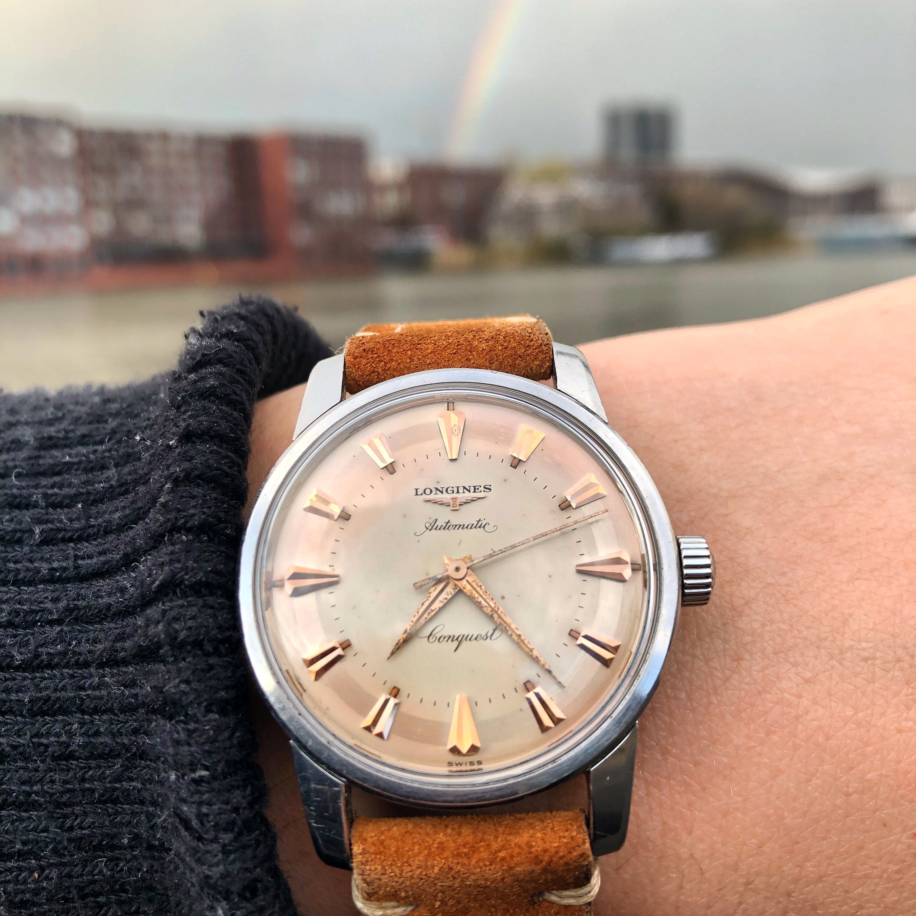 - Mijn longines conquest 9000 met rosegold hourmarkers en radium lume. De zilvere wijzerplaat is in combinatie met het rosegoud en radium roze verkleurd. De kroon is van een conquest heritage -
