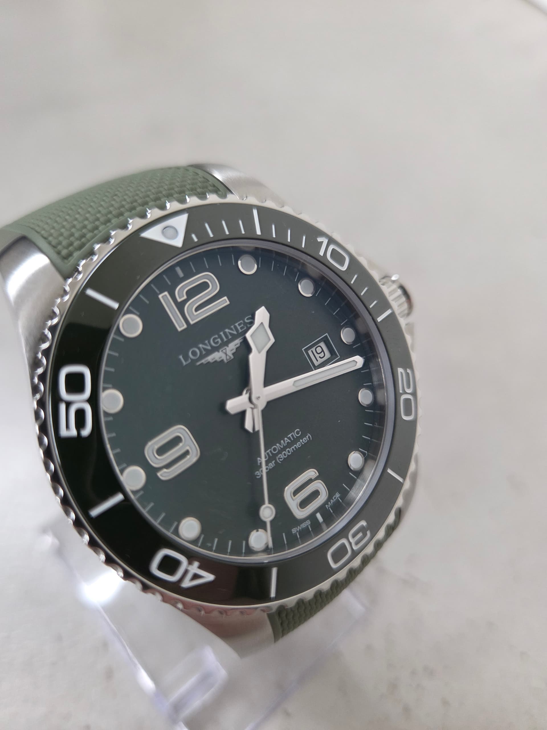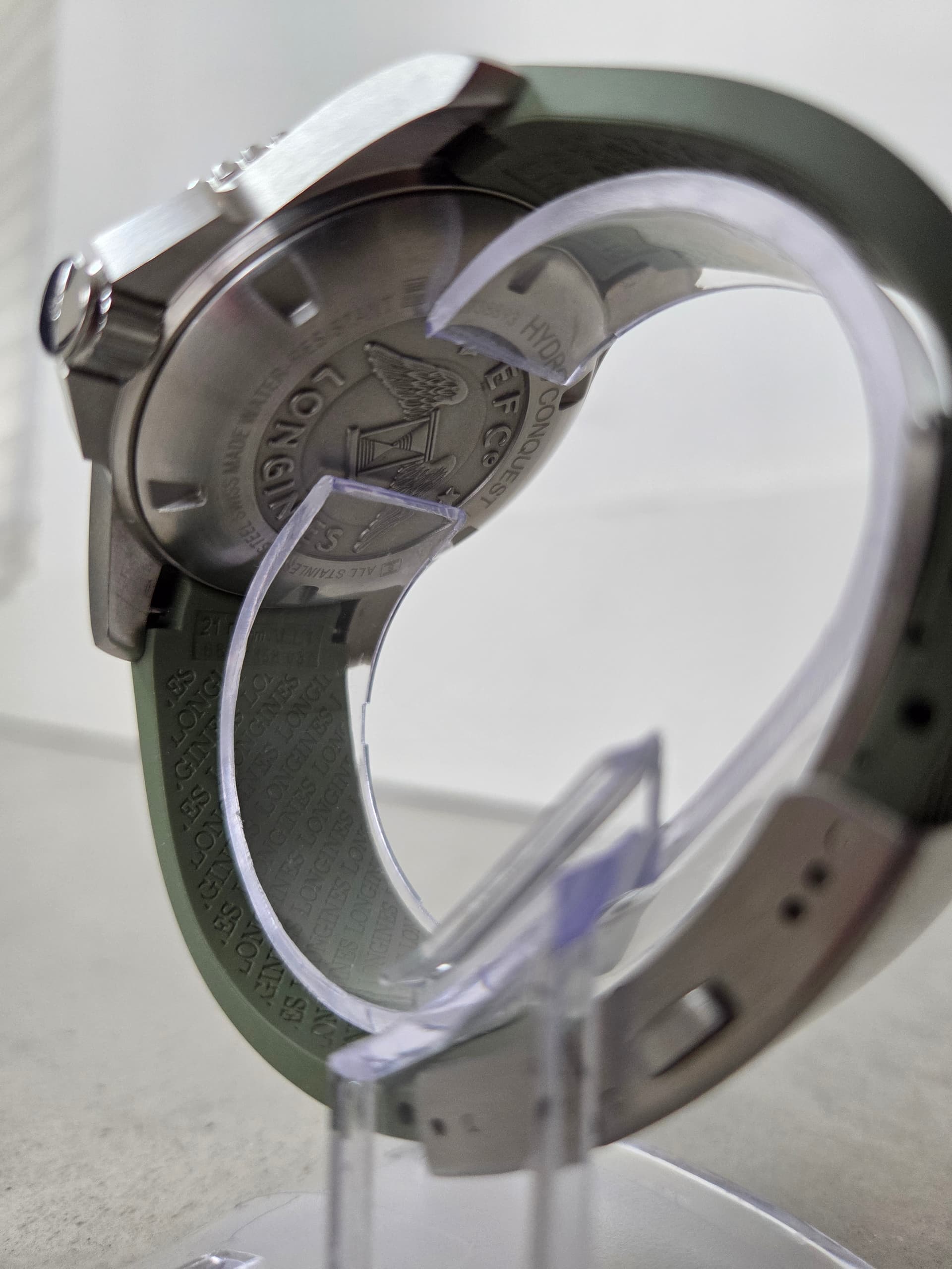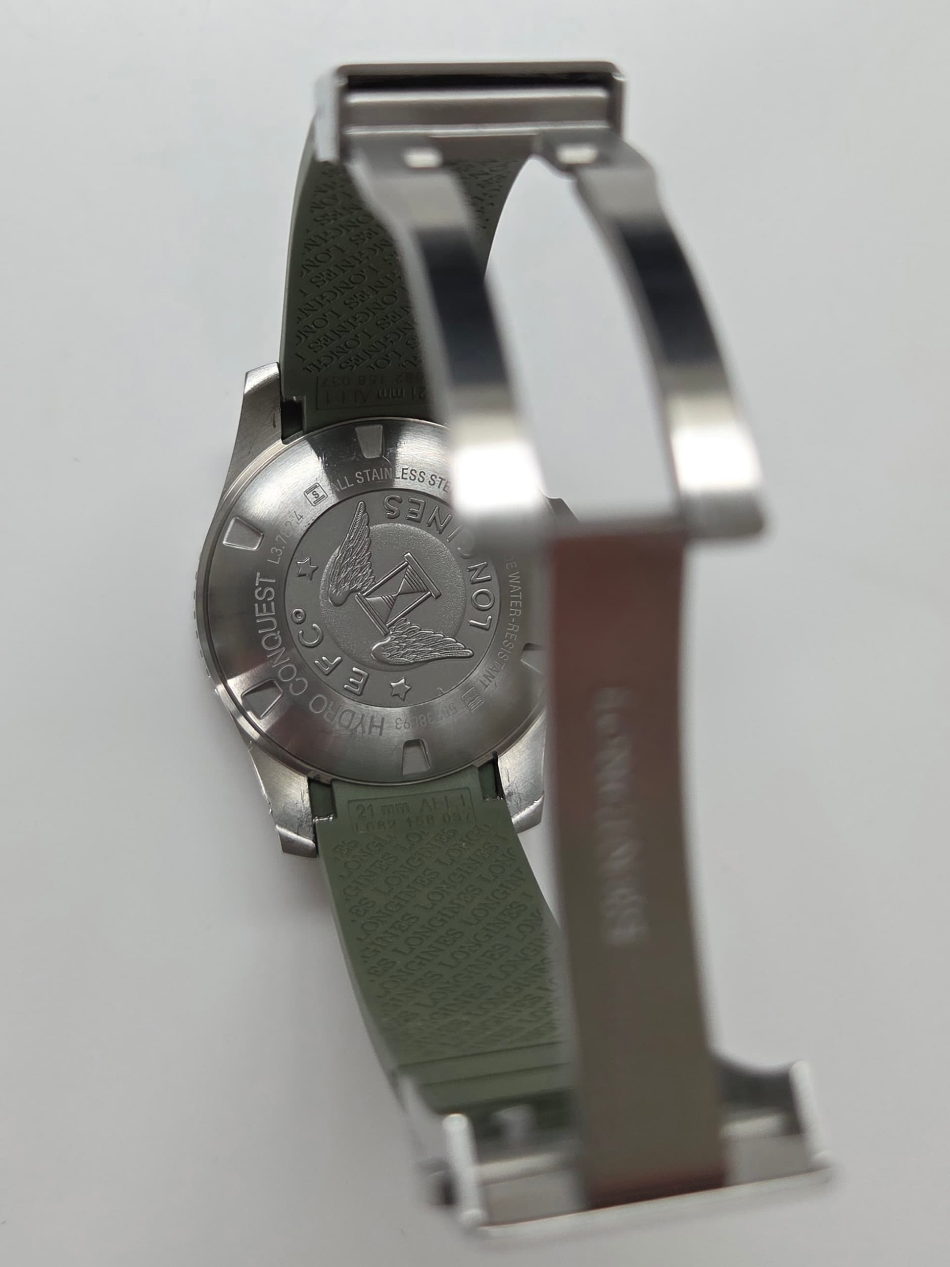 Deze hele mooi en in nieuwstaat verkerende Longines Hydroconquest 43mm uitgevoerd op de originele groene rubberband (geschikte polsmaat schatting 18-20cm range).