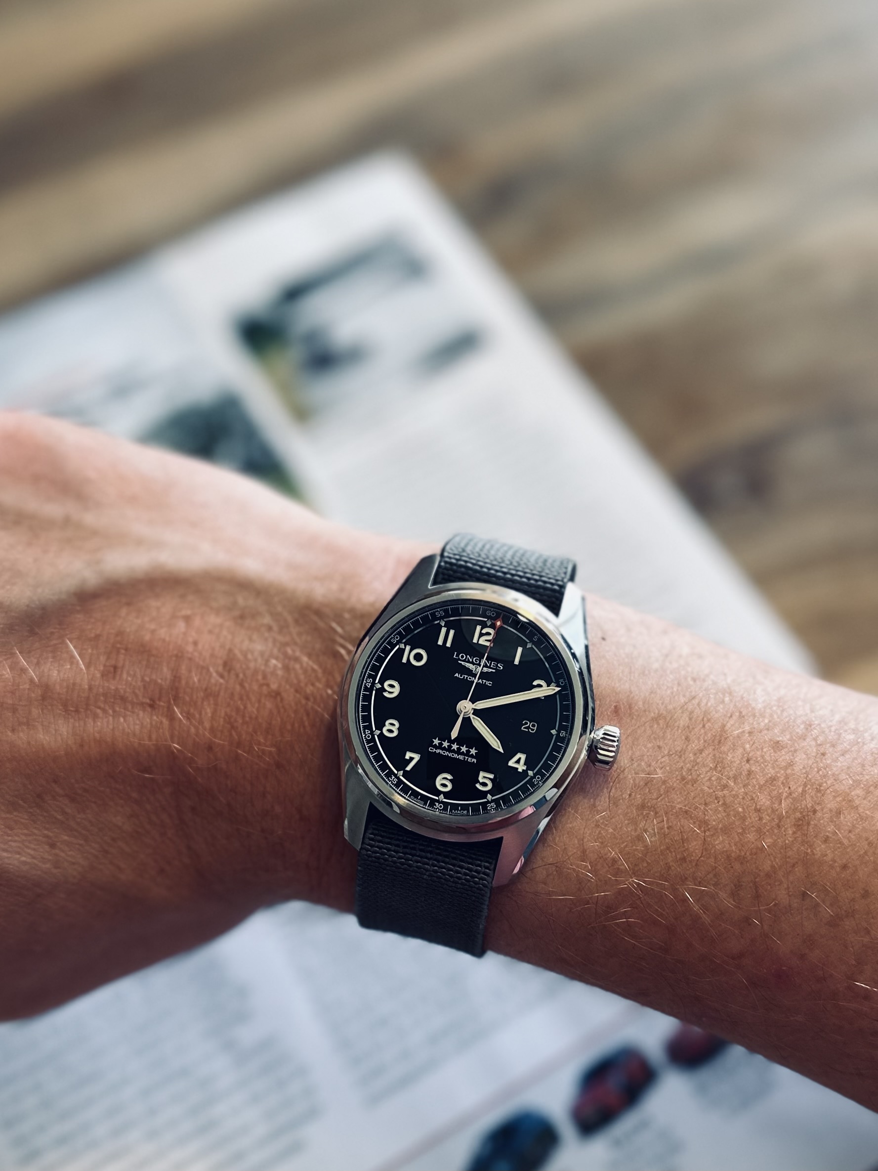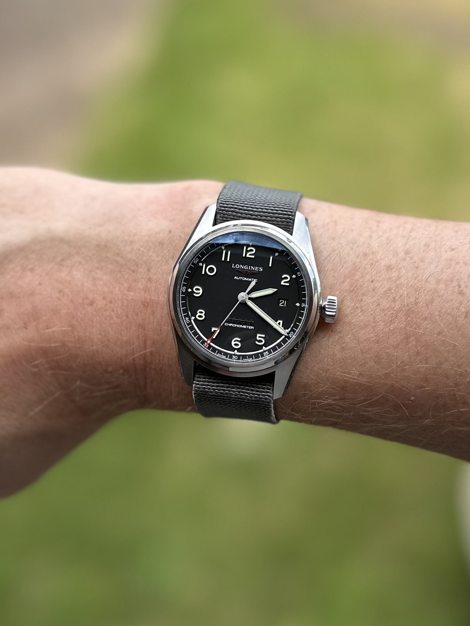 De band is licht elastisch en houdt het horloge misschien daardoor juist perfect op zn plek. Dit is overigens de 39mm dus die is wel iets kleiner en lichter. Maar had de oude ook op een Erika’s MN en dat droeg ook super.