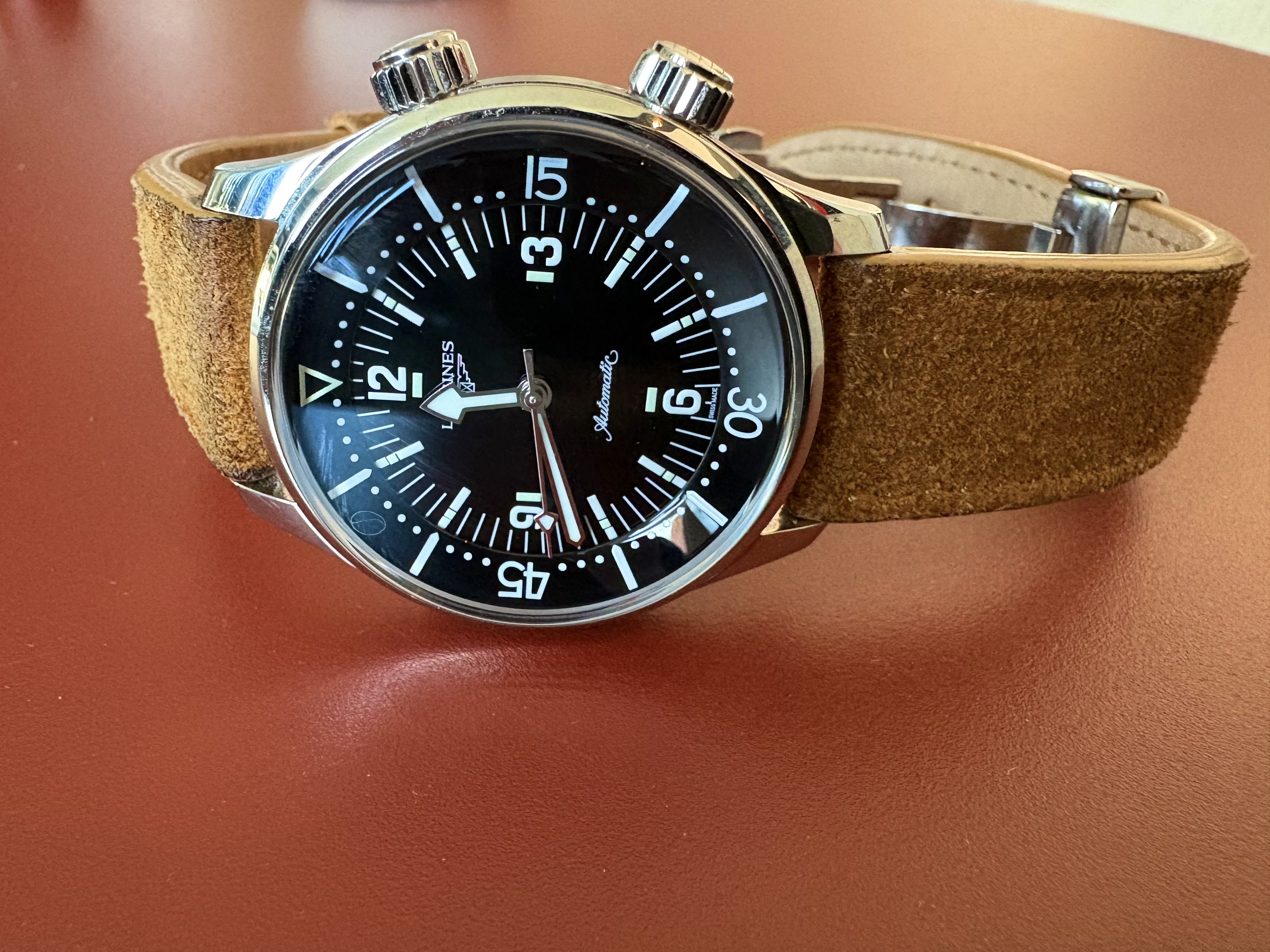 Ik heb hem net een paar uur in mijn bezit. Is de 40mm versie. Vrij dikke klok maar draagt wel lekker op leer. Longines staat bekend om de uitstekende afwerking en daar is dit geen uitzondering op. Het zichtbare binnenwerk is werkelijk prachtig (door Longines opgewaardeerd ETA/Valjoux 7751 caliber)