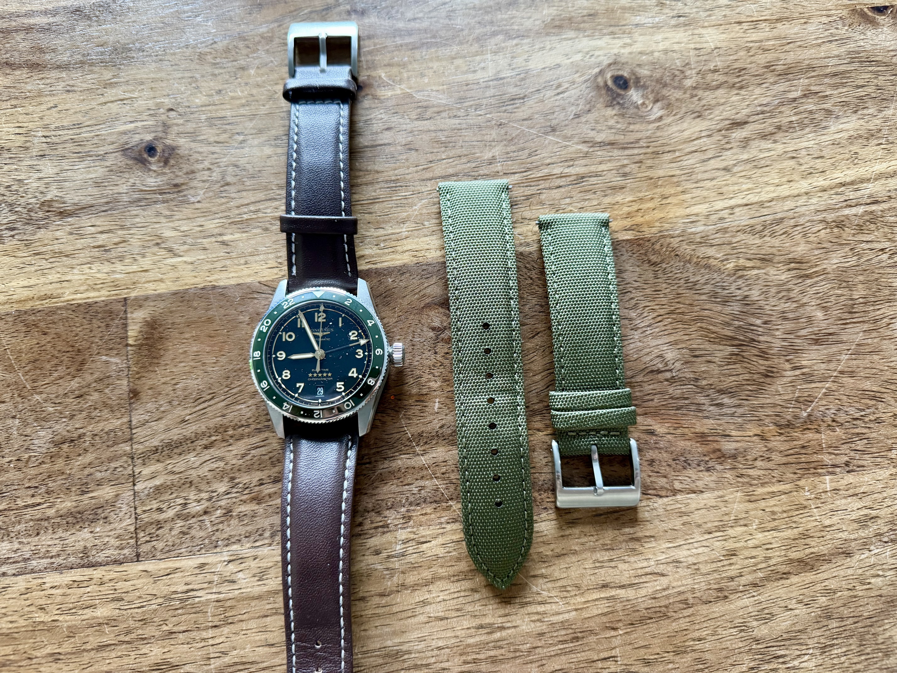 Het groene bandje was eigenlijk een uitprobeersel, ik heb het bij onze oosterse vrienden van Ali besteld. Ik heb de sluiting (die ziet er glimmend en goedkoop uit) gewisseld met een rvs sluiting van een ander bandje.