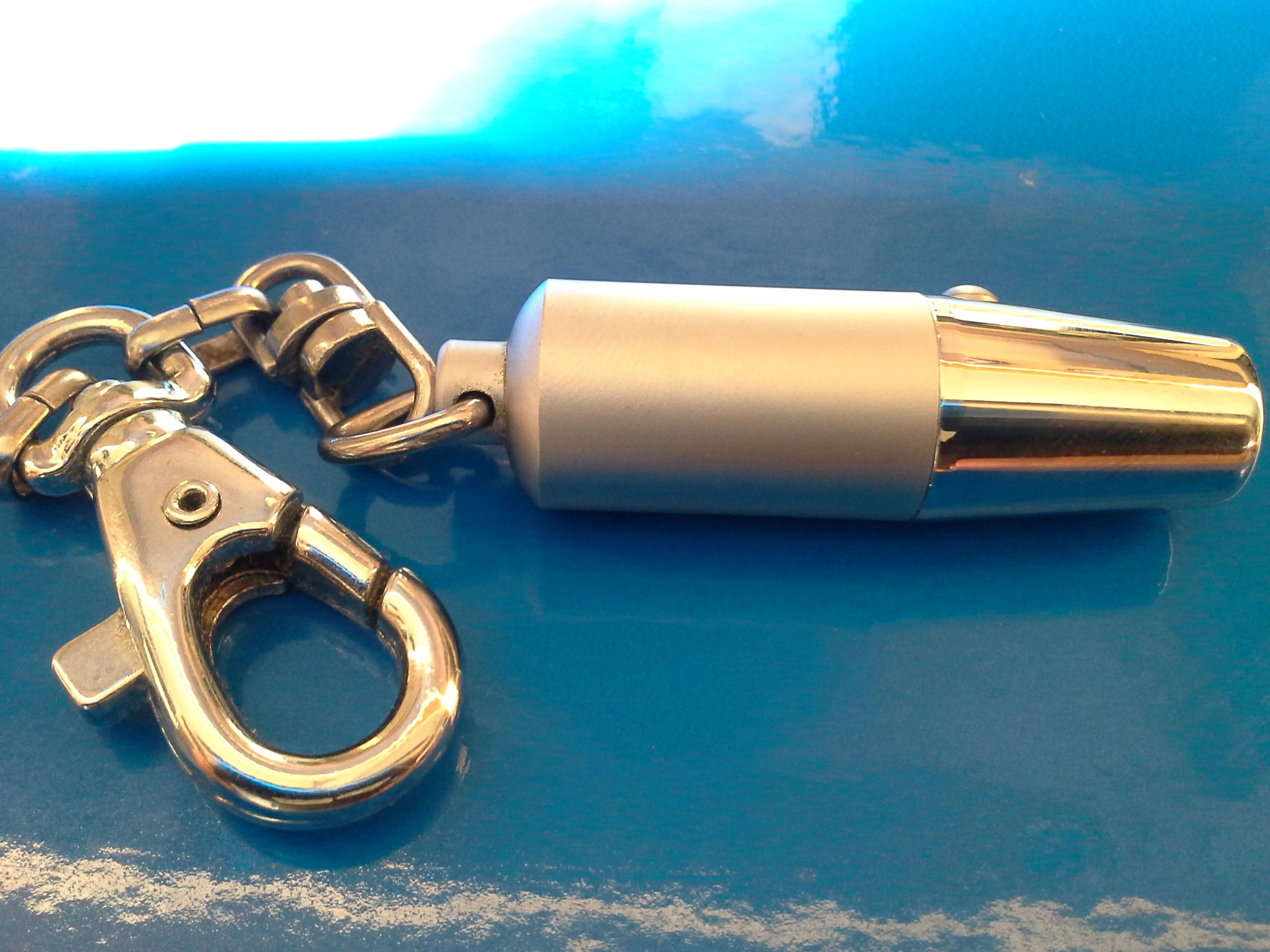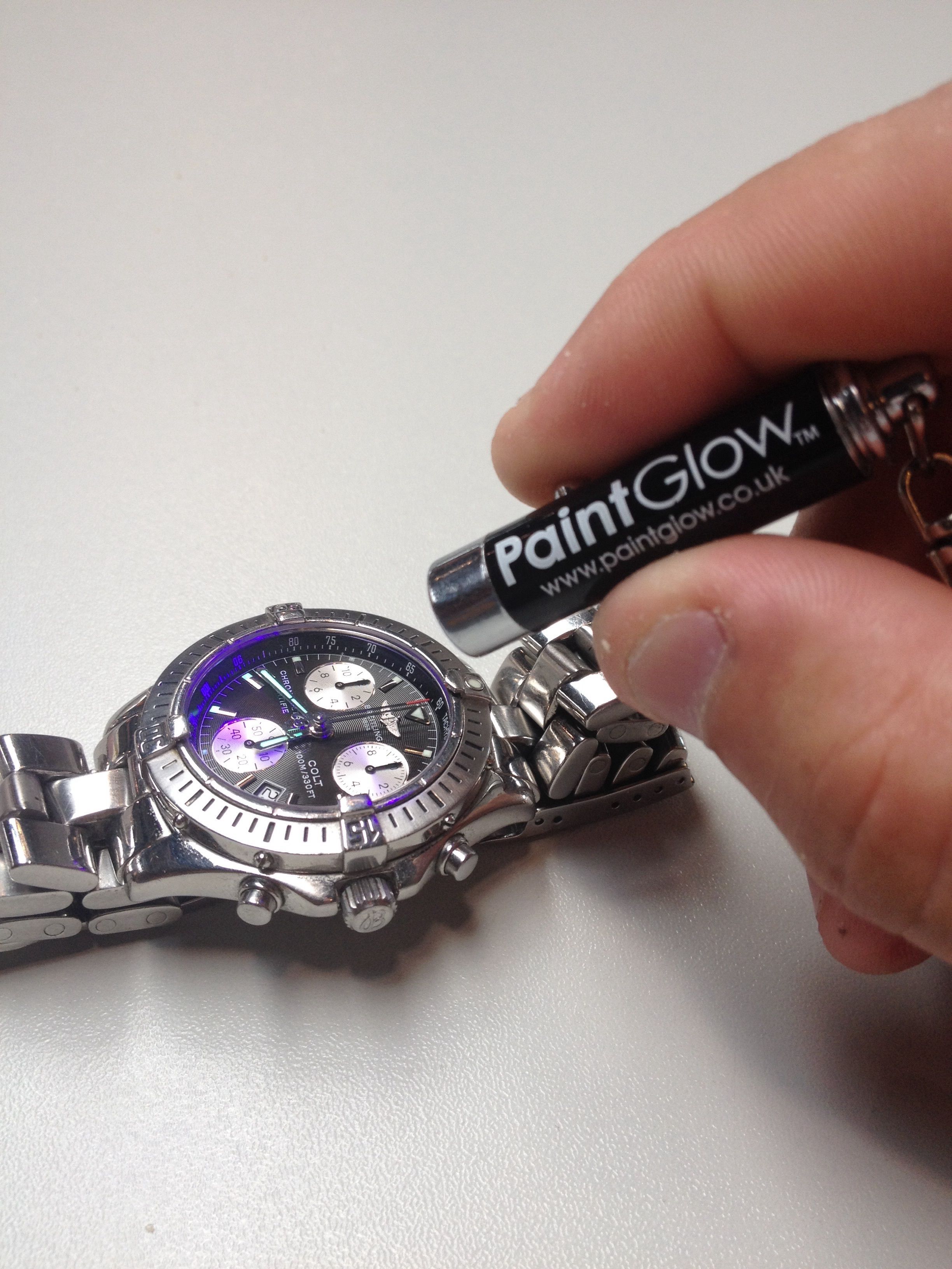 Dit is mijn UV lampje, past in het muntvakje van je portemonnee en kostte geloof ik twee euro, mijn horloges lichten daarmee op als een kerstboom…