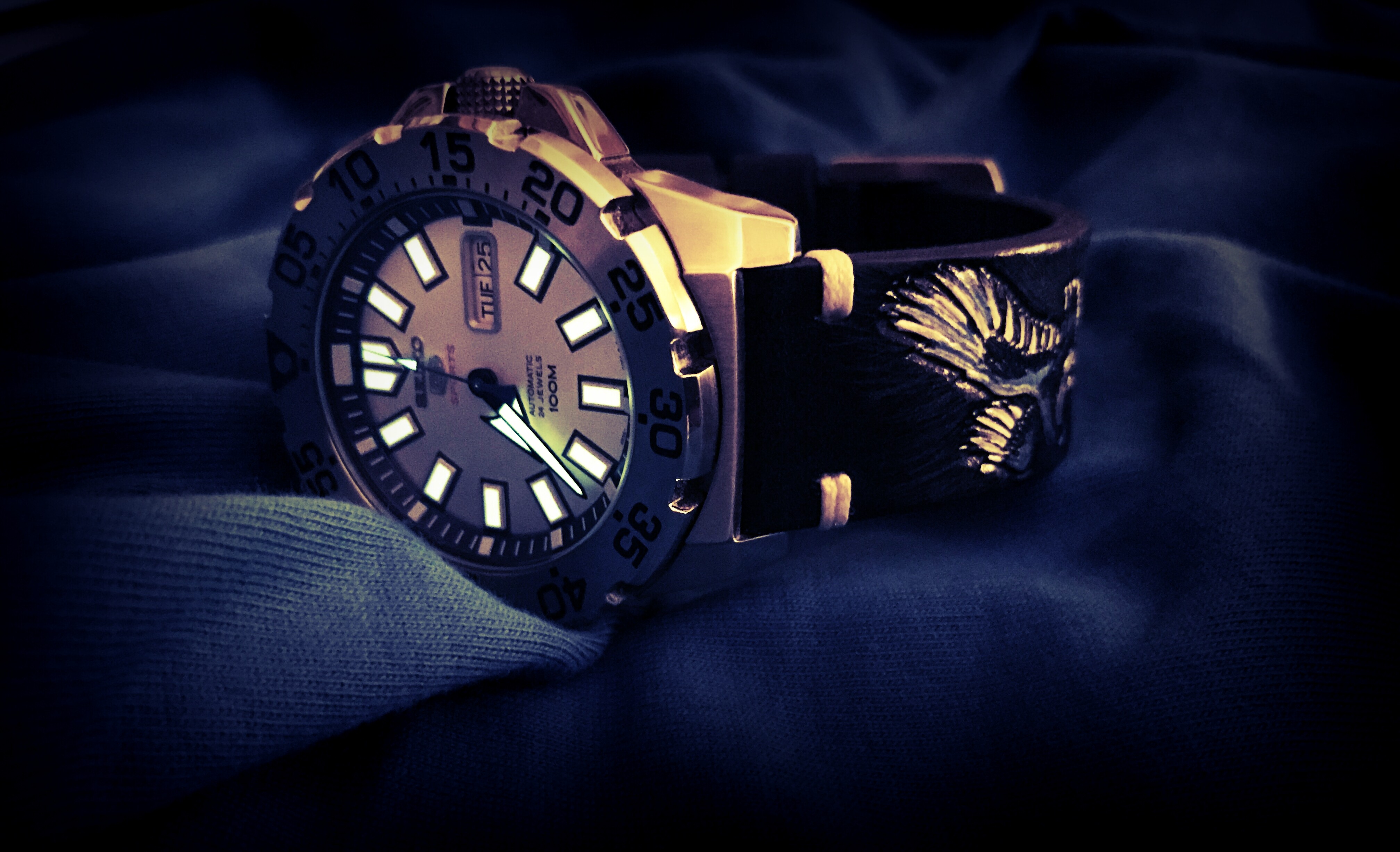 “Seiko” captain willard frankenwatch. Schijnbaar zijn de wijzerplaat en wijzers origineel Seiko en het uurwerk een NH35, maar de rest is bij elkaar geraapt van Nakomi en WatchandStyle zo heb ik me laten vertellen…