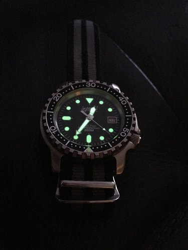 Zonder het express op te laden werkt de lume zeker goed van de reïnterpretatie van de 62mas (Seiko). Lastig op de foto te krijgen, maar middels de camera van de Lightroom app toch nog net kunnen vangen in bed.