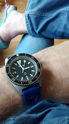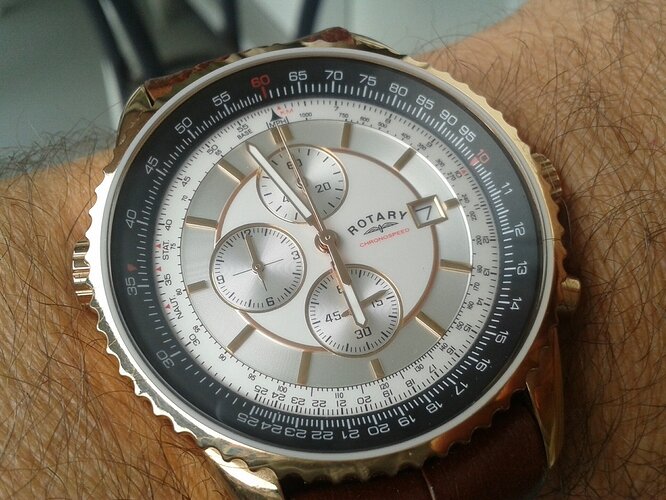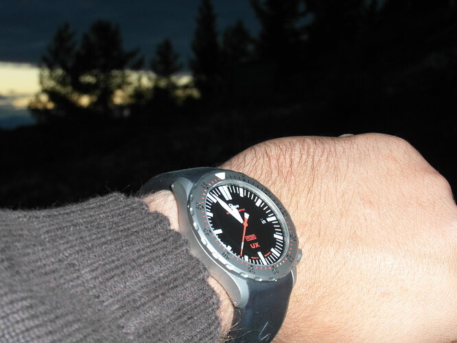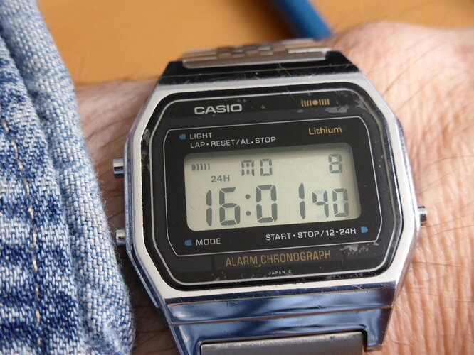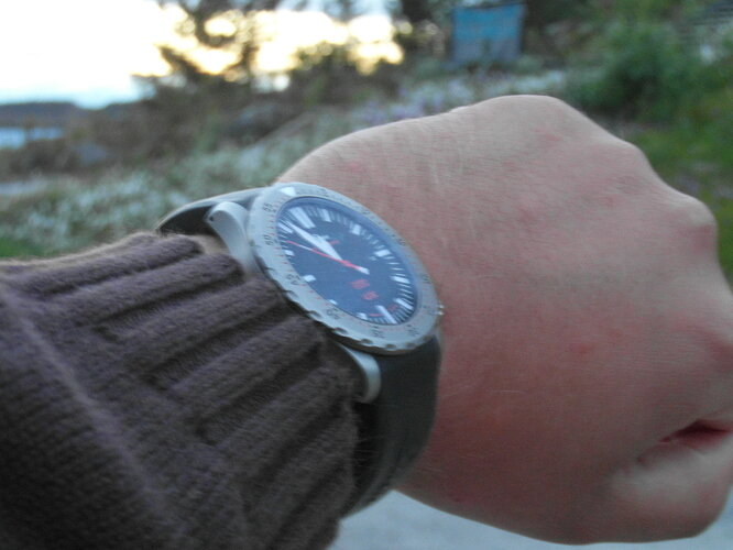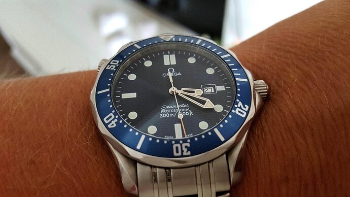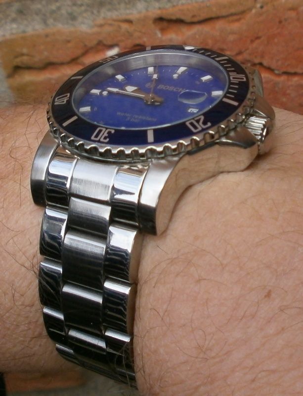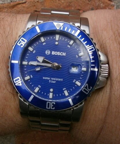 Dit is er zo een. Een leuk Bosch (ja, van de boormachines enzo) horloge met piepklein Miyota quartz loopwerkje erin, maar toch stevig en van degelijk rvs. Solide rvs armband, interne datumvergroter (dus onder het glas), leuke “wave” wijzerplaat en keurige wijzers, die ik niet overal tegenkom (gelukkig niet de alomtegenwoordige imitatie Rolex mercedes wijzer). Toen ik 'm gebruikt kocht (was nergens meer nieuw te koop), was die wat ruw, waarschijnlijk los in een la liggen schuiven, maar na een beetje polijstwerk, zo weer netjes. Inmiddels al een paar keertje het kleine batterijtje moeten wisselen, maar die kosten ook maar weinig, als je een kaartje tegelijk koopt.