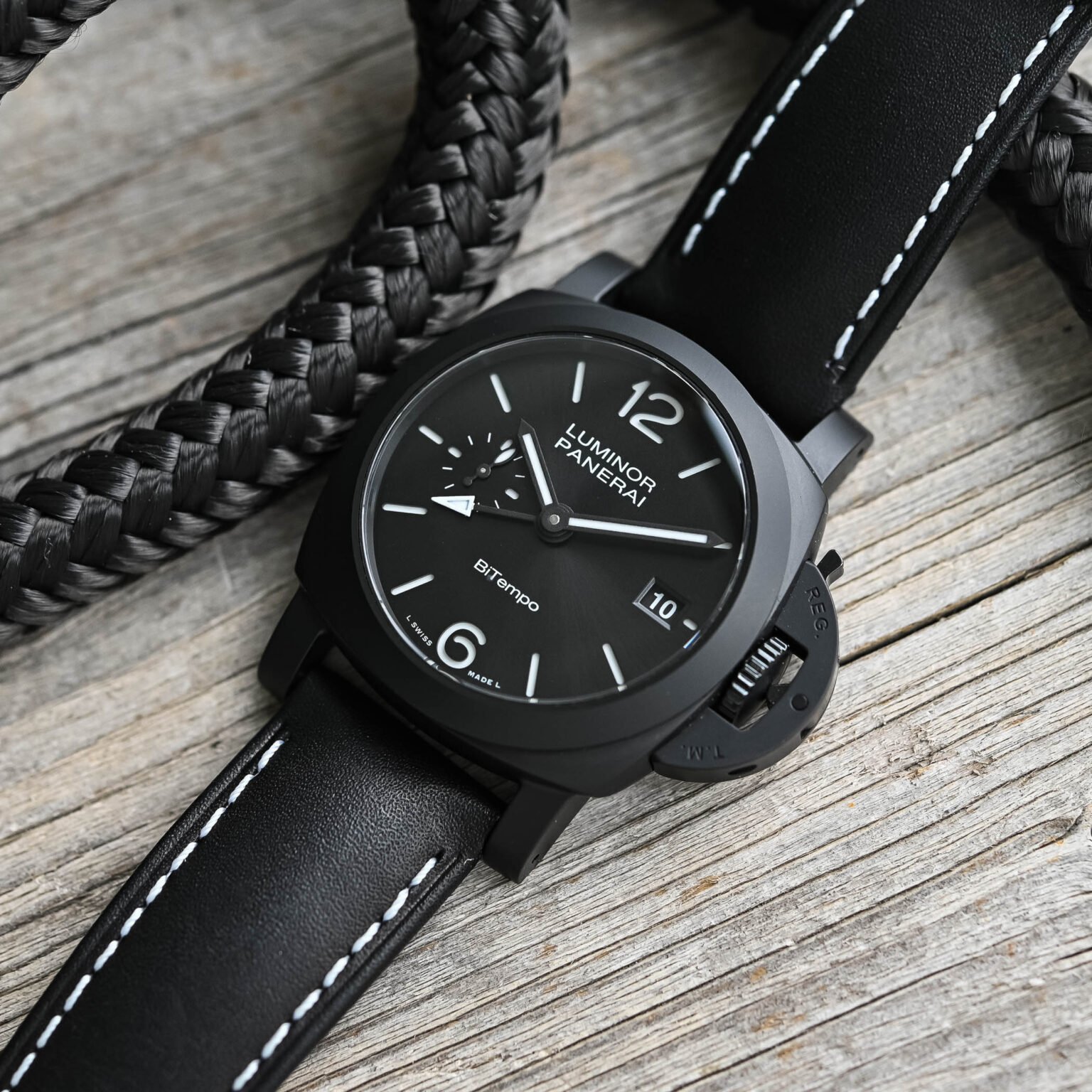 De look is onmiskenbaar Luminor, maar dan compacter en in een ‘stealth’ uitvoering. De 40mm kast is gemaakt van gezandstraald, matzwart keramiek.