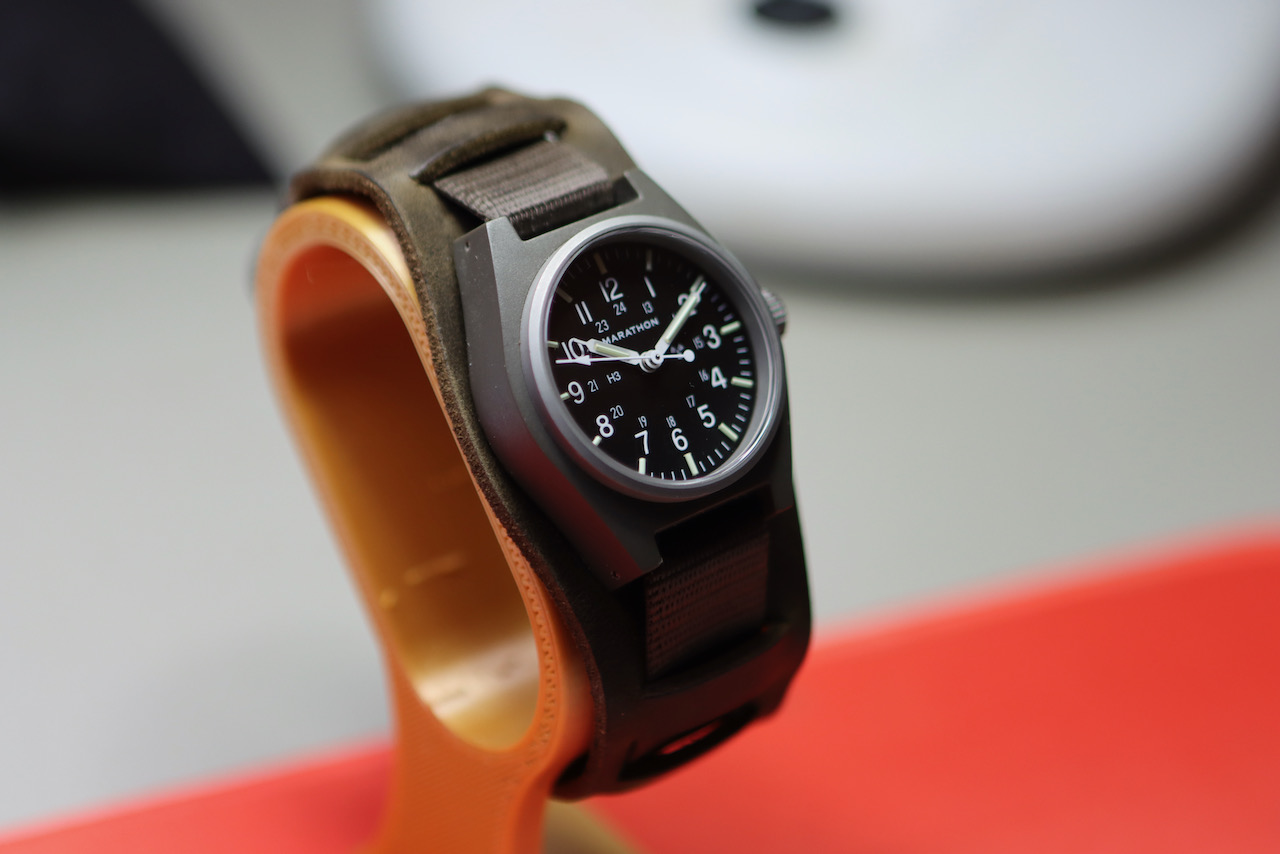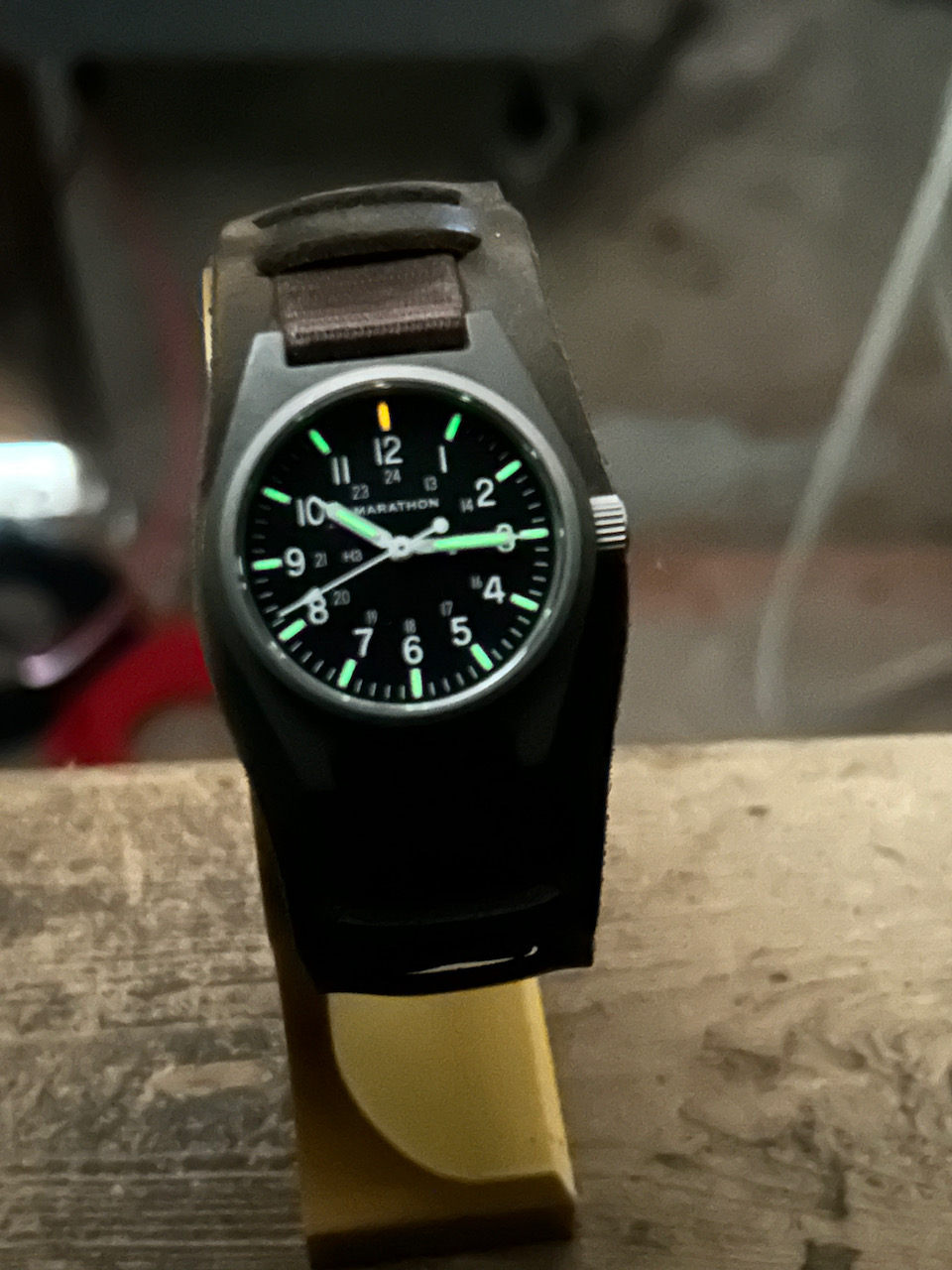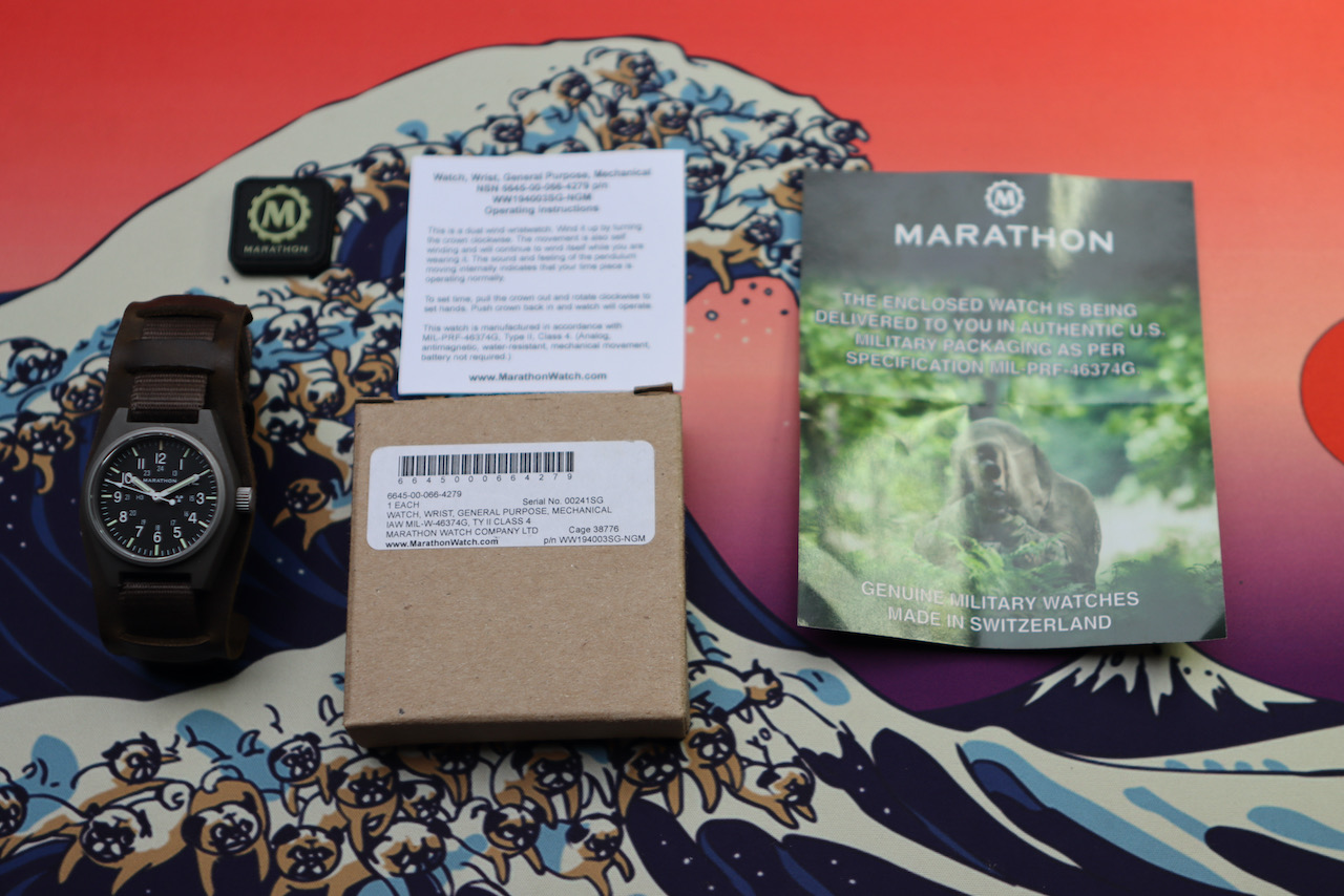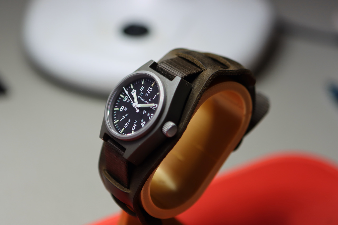 Mijn horlogedoos is te vol en ik laat een aantal gaan die ik toch niet draag. Deze mooie mechanische Marathon GPM heeft een saffier glaasje en zit op het originele bandje met leren Bund strap eronder. Draagt daardoor erg comfortabel. Heeft weinig polstijd gehad en heeft minimale draagsporen. De radioactieve tritium lume buisjes zijn nog lekker fel, van de 25 jaar halfwaardetijd is 8 jaar verstreken.