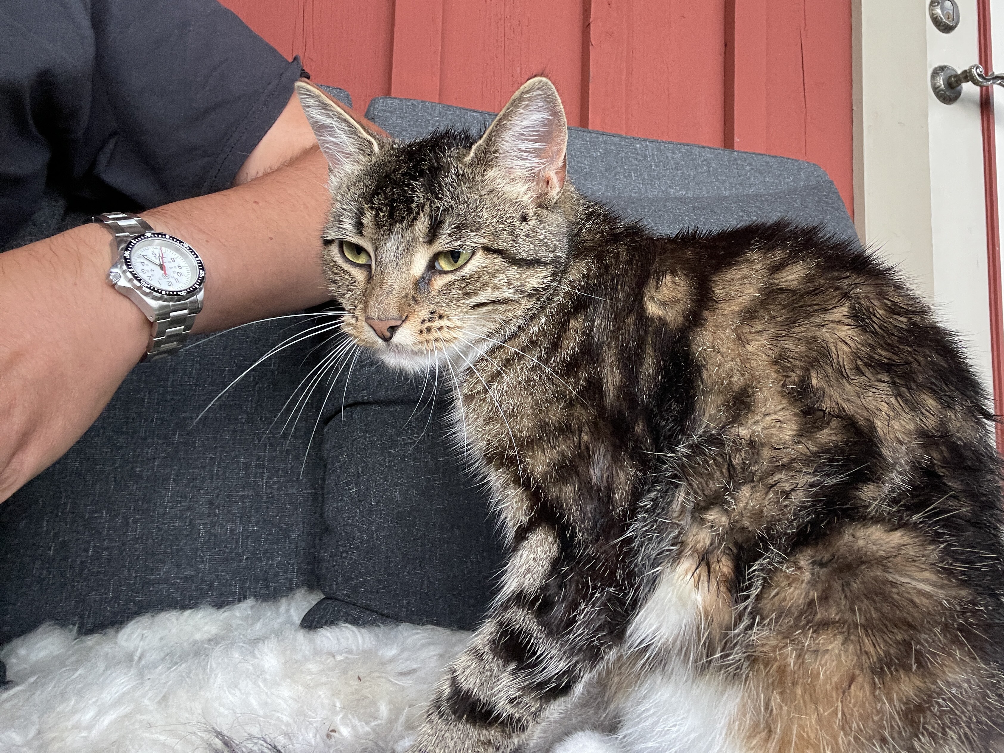 Bij gehuurde huisje kwam een kat schuilen voor de regen. Gezellig met z’n tweeën op de veranda.