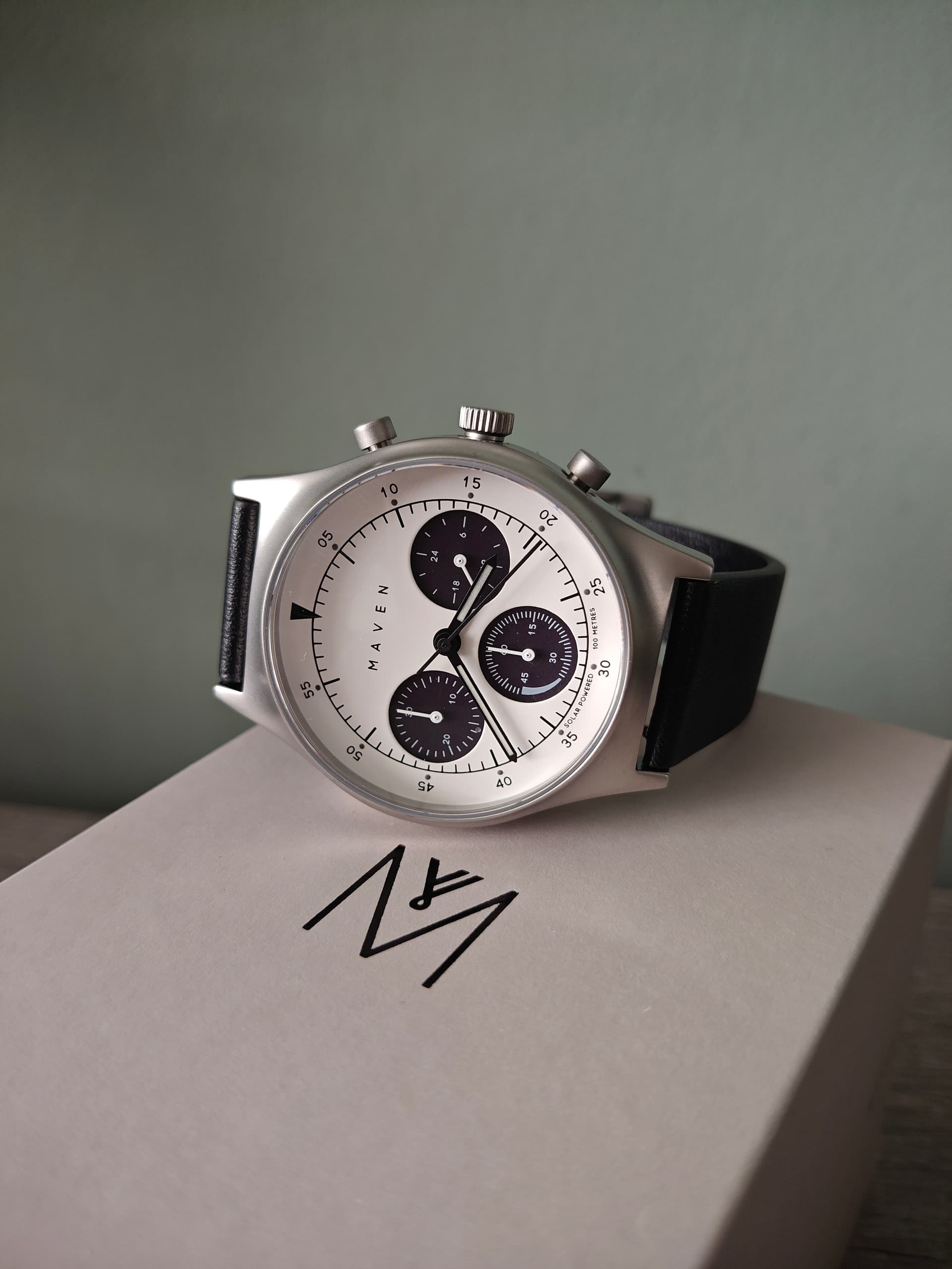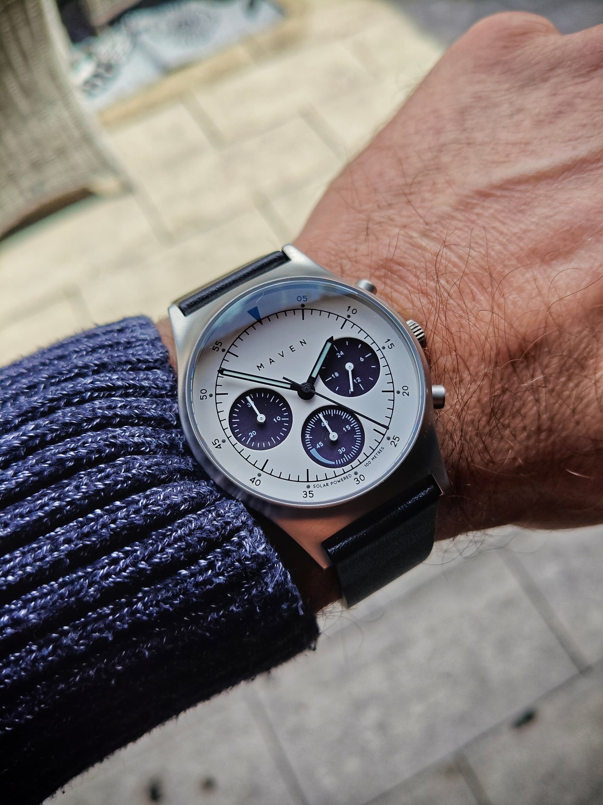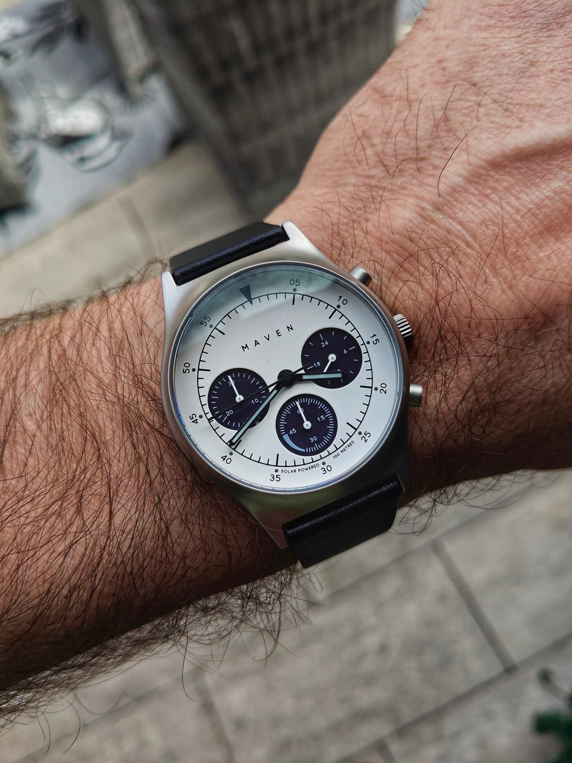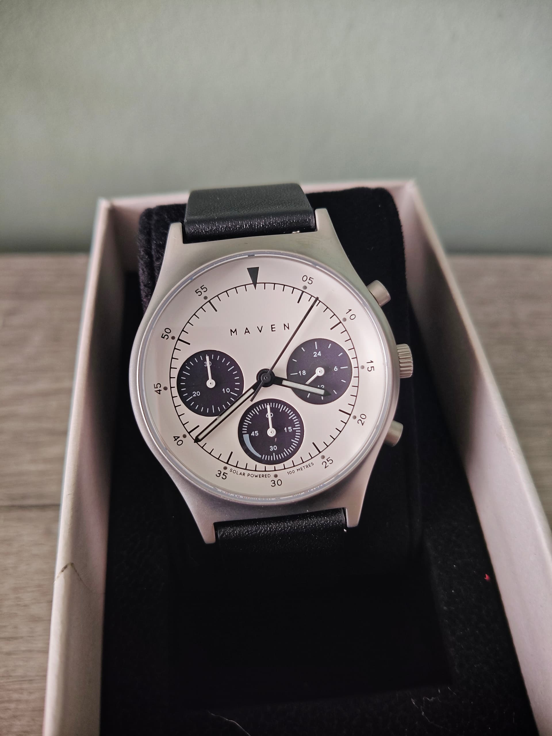 Te koop : Een zo goed als nieuwe Maven - Mus C-05. Na lang nadenken heb ik besloten mijn horlogecollectie een beetje te verkleinen. Deze topper mag een nieuw polsje vinden! Dit horloge is zgan en is nauwelijks gedragen. Ik kan geen gebruikerssporen vinden dus ik geef hem een 99%. Deze panda chrono is een solar dus het is oppakken en gaan.