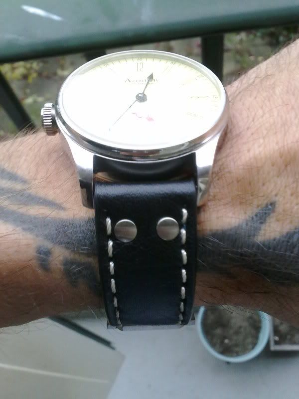 Ik ben het met iedereen eens dat het door Azimuth meegeleverde bandje teleurstellend is. Hoewel de gesp mooi en het leer erg soepel is, werkt de aardigheid van de in de kleur van de wijzerplaat geverfde zijkant in het nadeel omdat dat niet blijft zitten. Ook de kleur van de band zelf “scheurt” bij het samenwrijven met de kast.