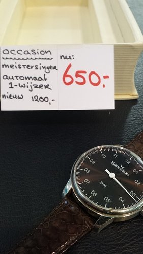 Zag vandaag bij juwelier van der Meij in Apeldoorn een Meistersinger No 1 liggen voor volgens mij een leuke prijs. Hij staat voor €650,- in de etalage en dan gaat er nog 30% vanaf. Waarschijnlijk moet iets meer korting ook nog wel lukken. Op de foto staat dat het een automaat is maar het is natuurlijk een handwinder.