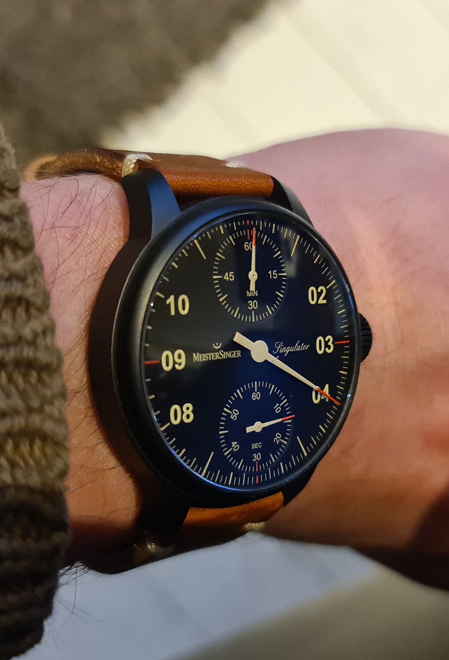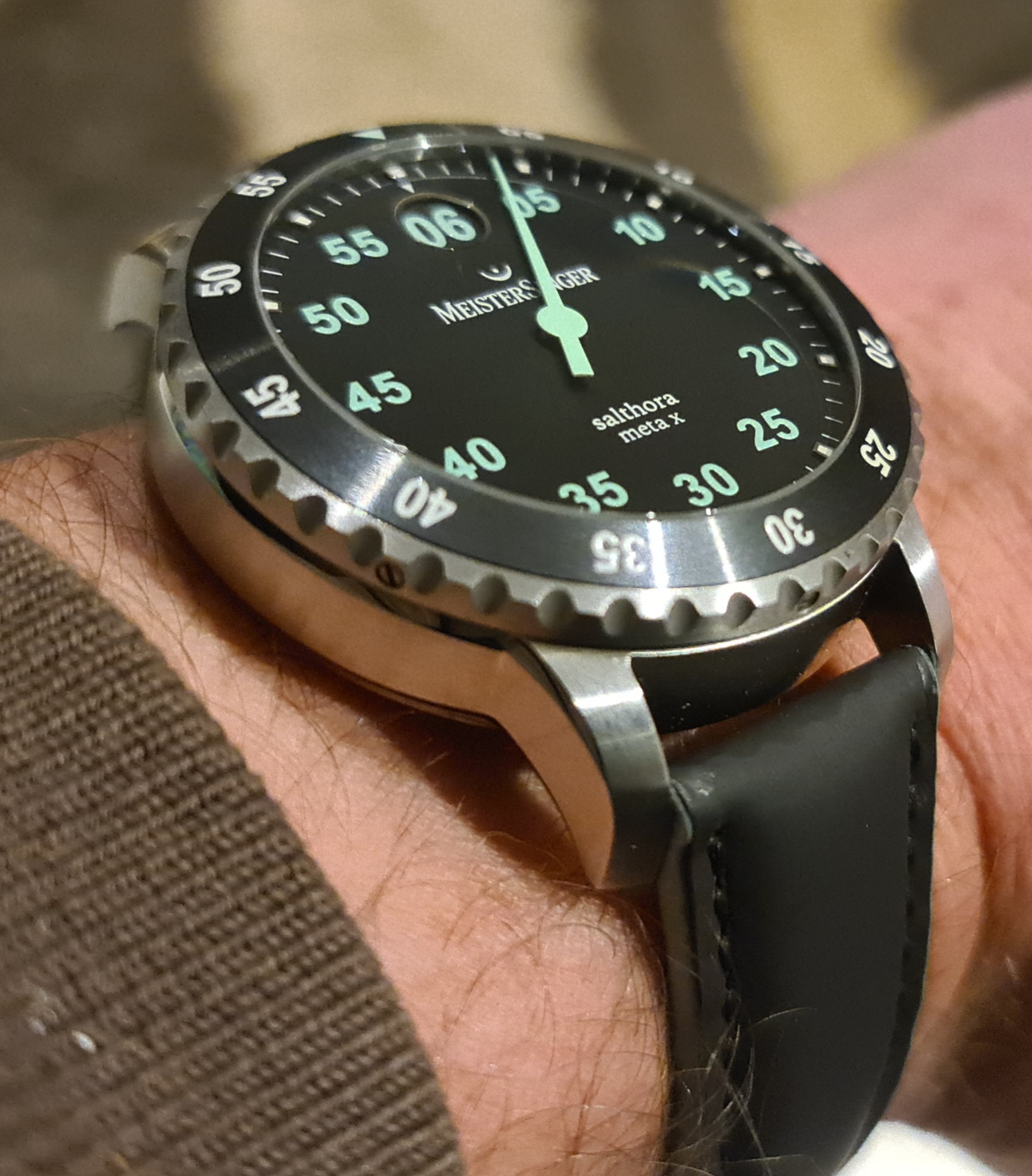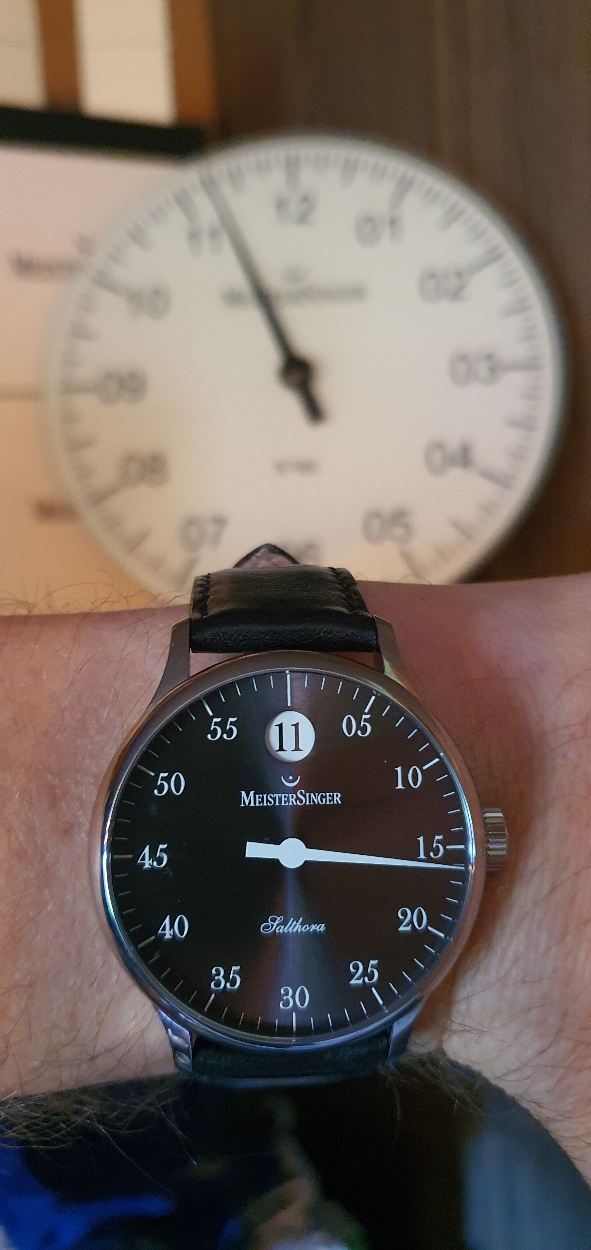 Hier wel. Het 24uurs-model op 2 verschillende banden. Ik moet wat keuzes maken in welke horloges te houden en welke niet, deze overwoog ik wel eens weg te doen, maar dat duurde nooit lang, want van Meistersingers kan ik moeilijk afscheid nemen.
