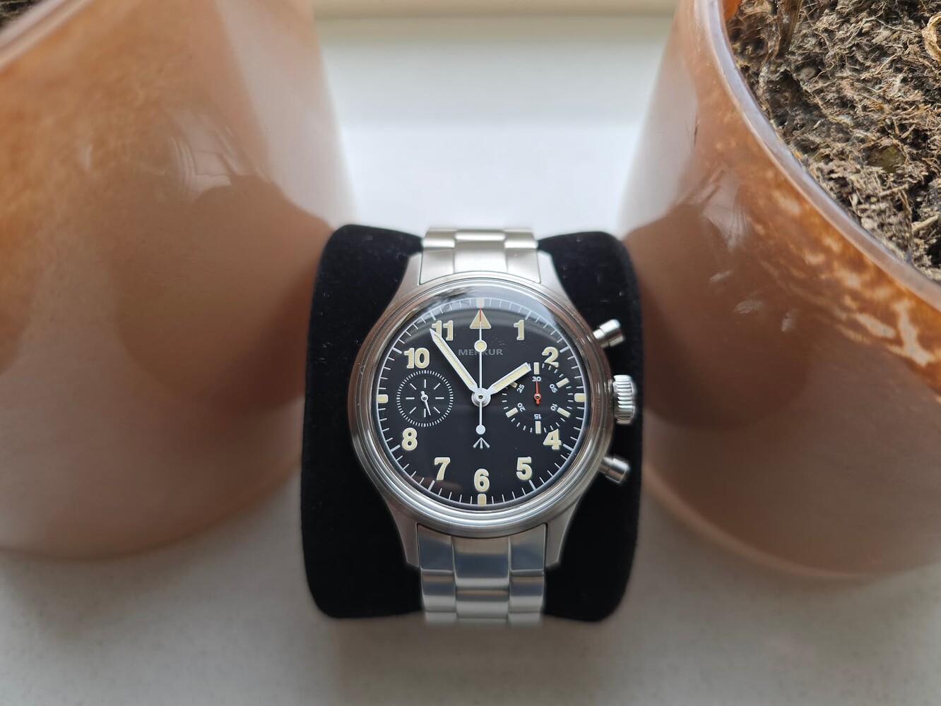 Originele doos en/of eventuele accessoires:Etuitje van Merkur met boekjes, 3 lederen bandjes, 2 natos en 2 parachutestof bandjes