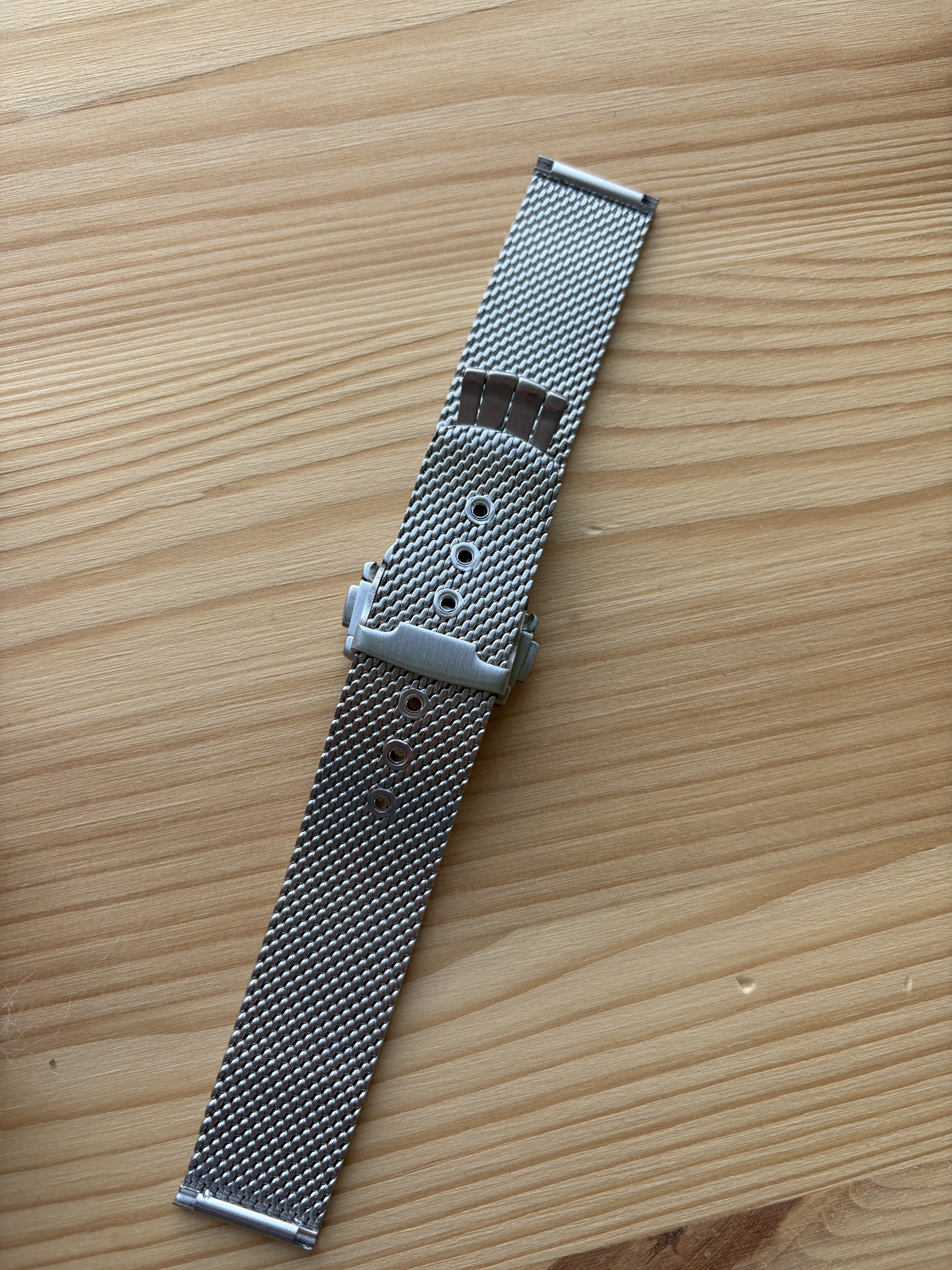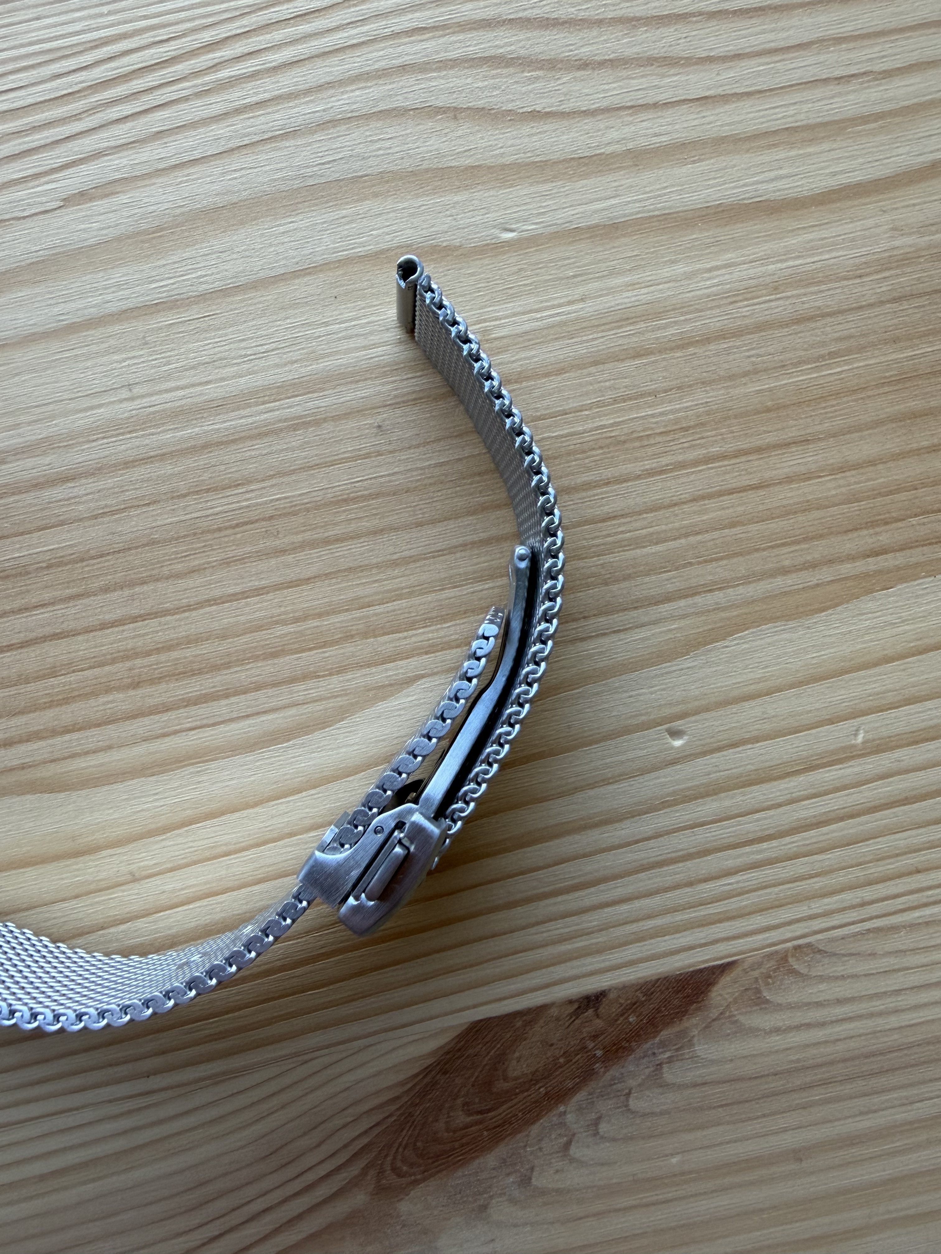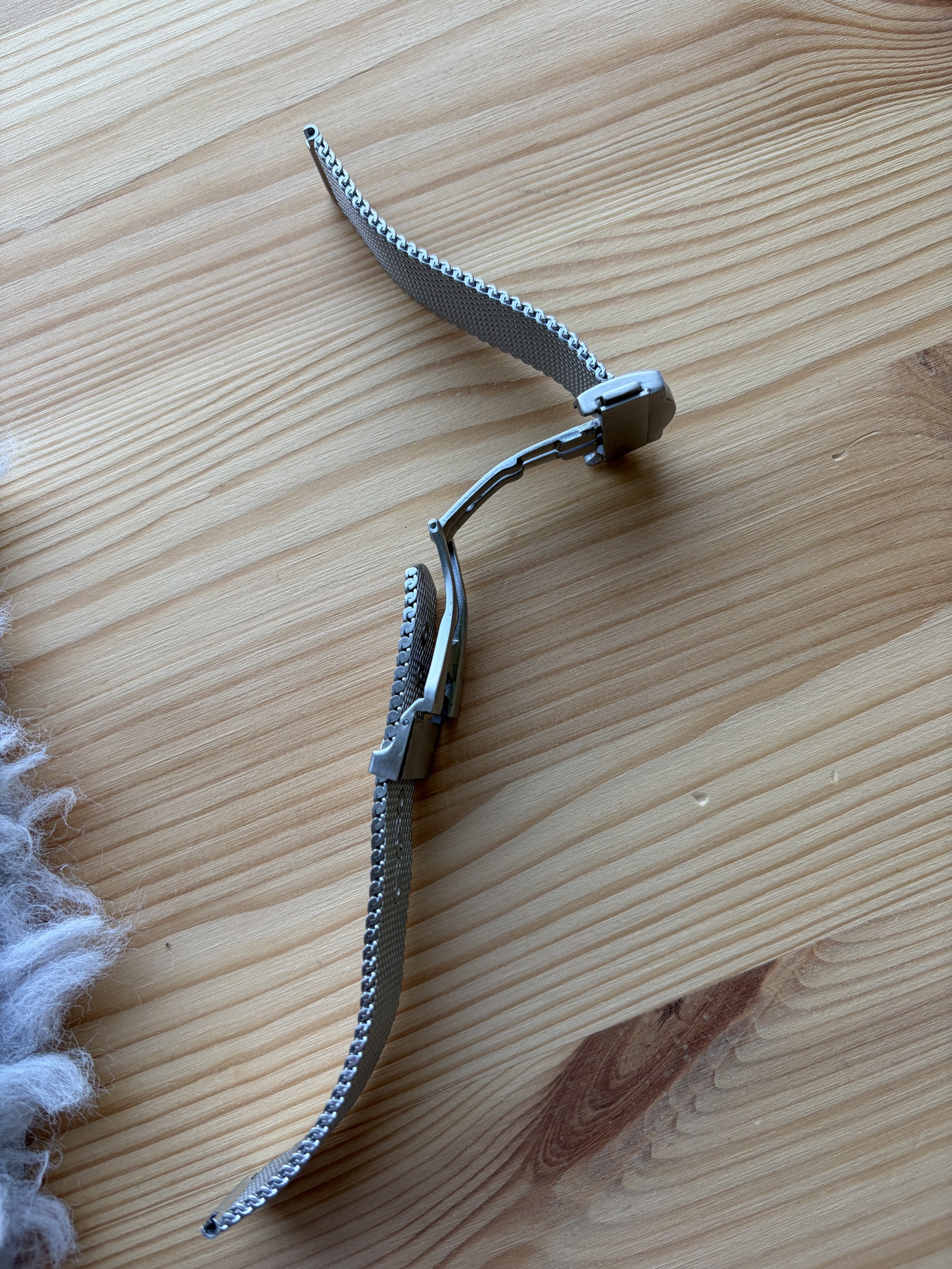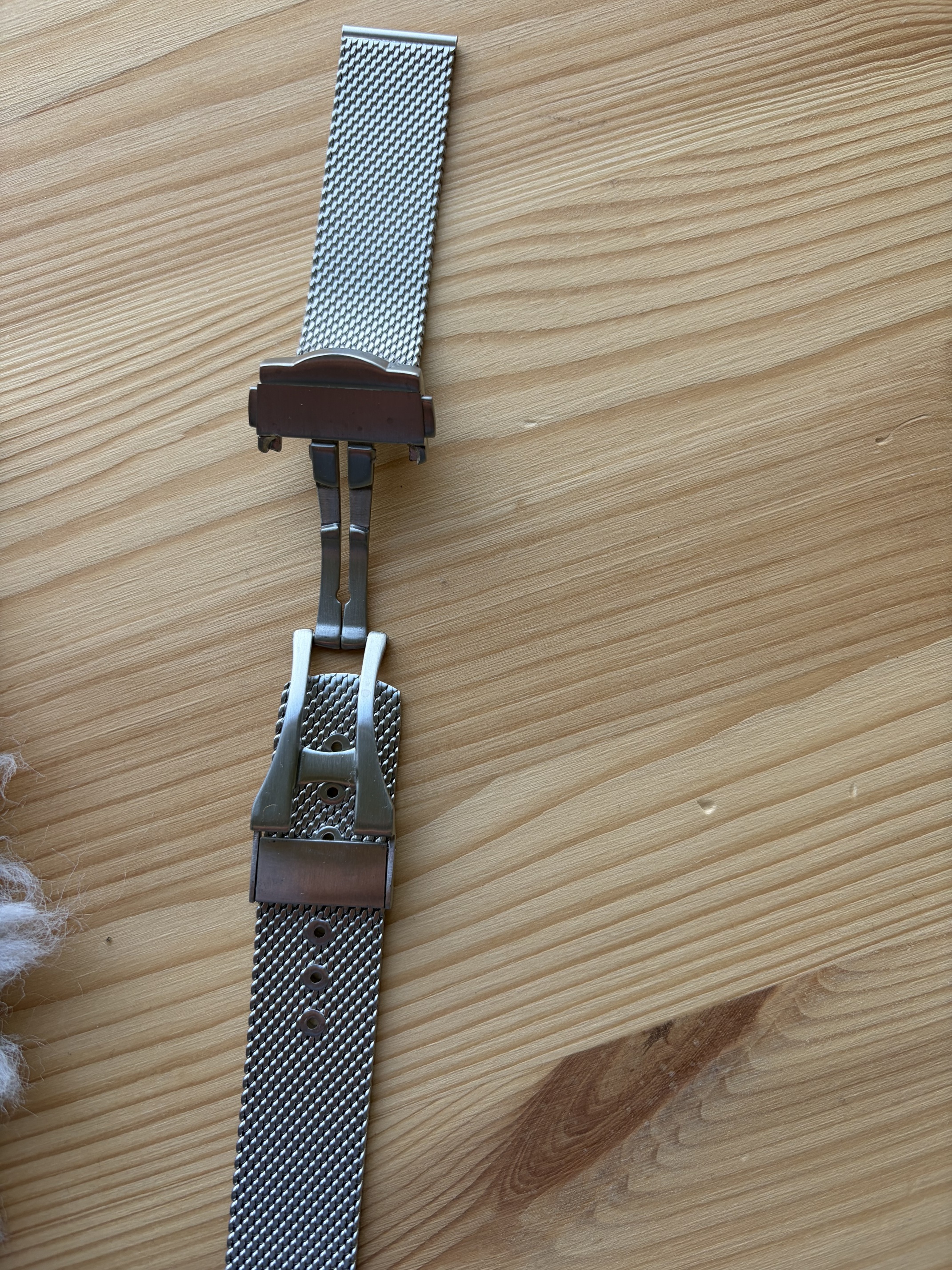 Mesh band, mat met vouwsluiting. Zelfde stijl als omega. Mag weg omdat ik inmiddels een originele heb.