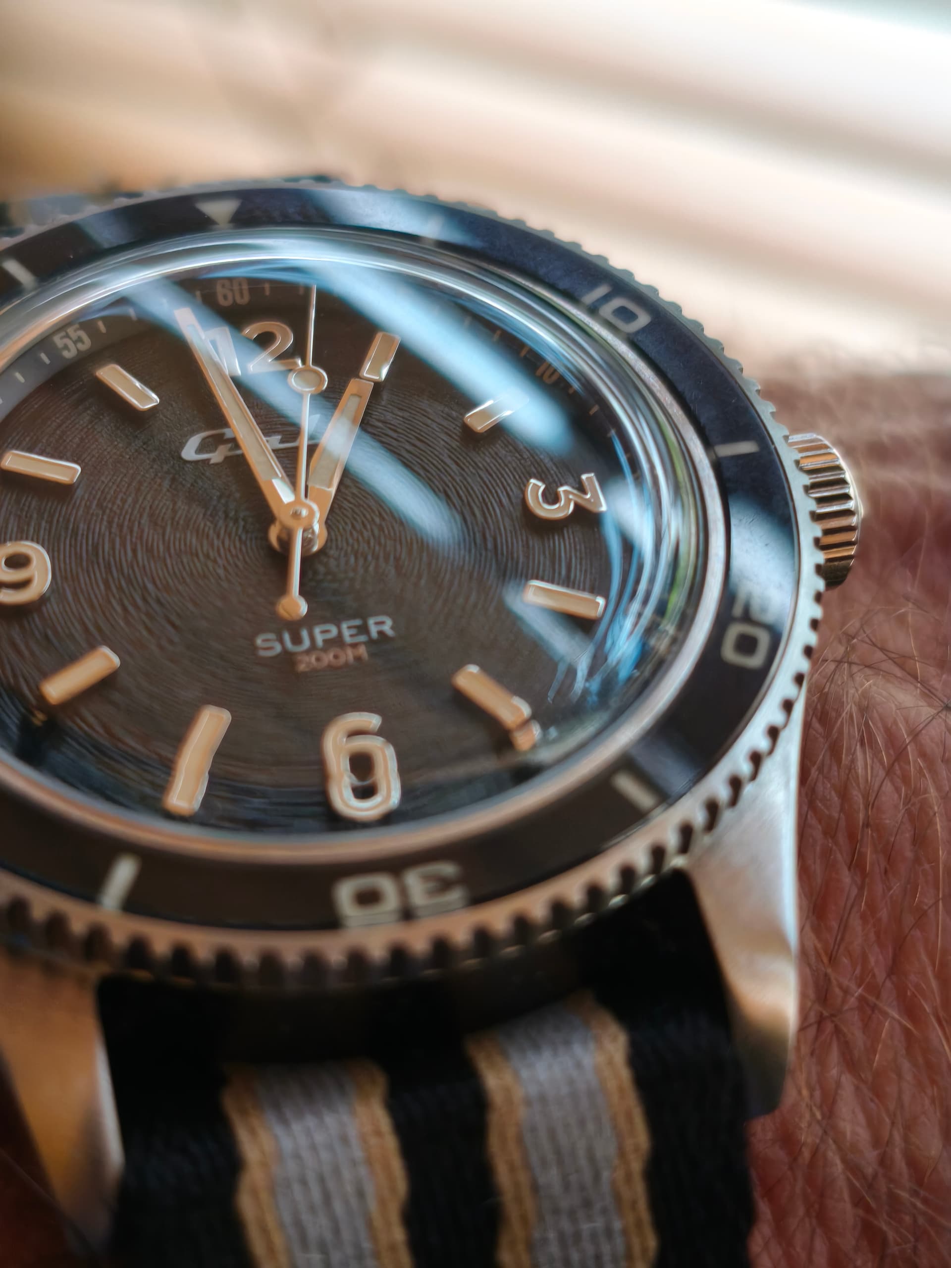 Nog iets te duikerig, maar wel een sympathiek merk, en de intern draaiende bezel met een tweede kroon wat ik wèl op m’n lijstje heb staan.