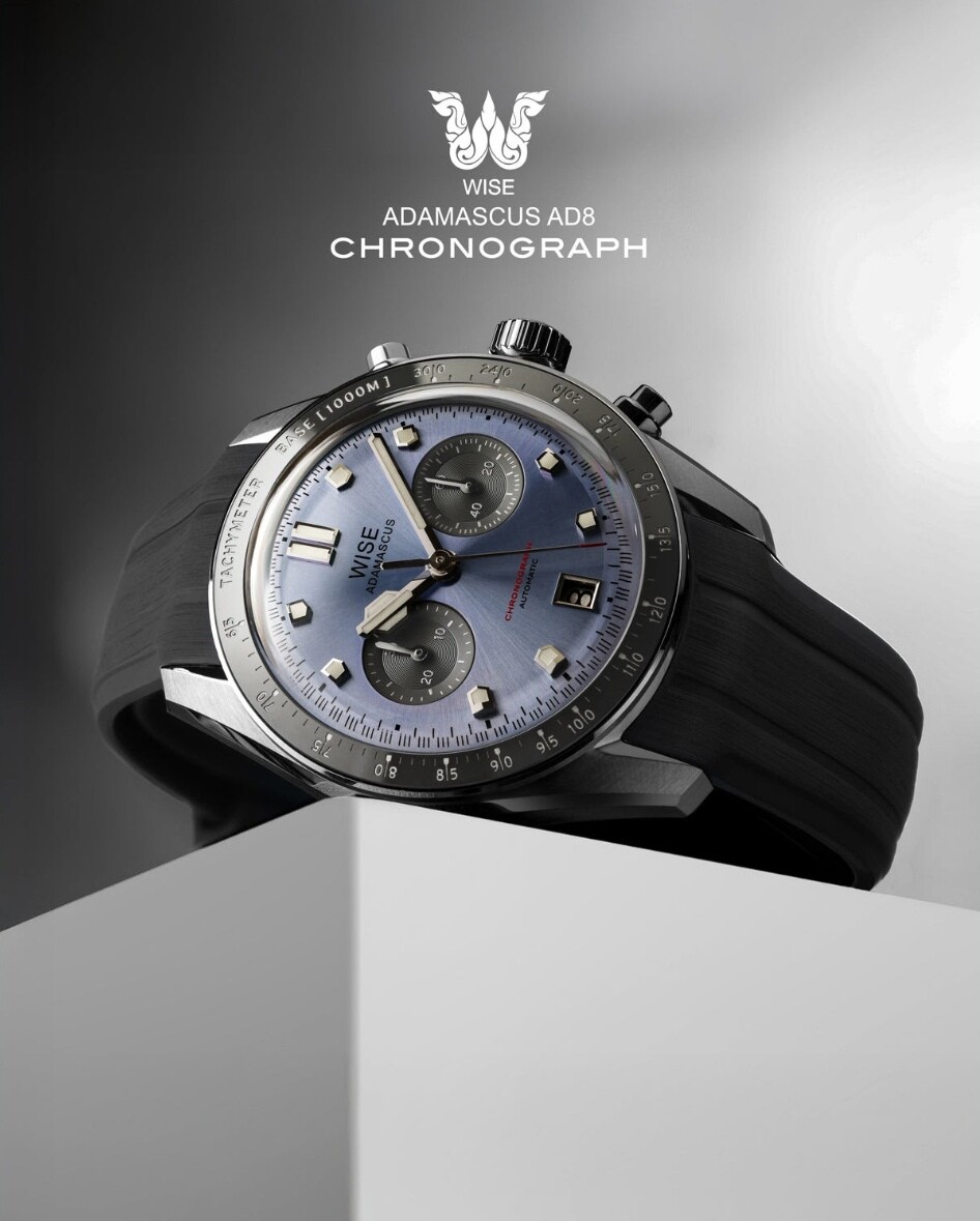 Fraai gekleurde chronograaf van Wise op komst. Lichtblauw kennen we natuurlijk al wel, maar dit heeft een haast lila tintje erin.