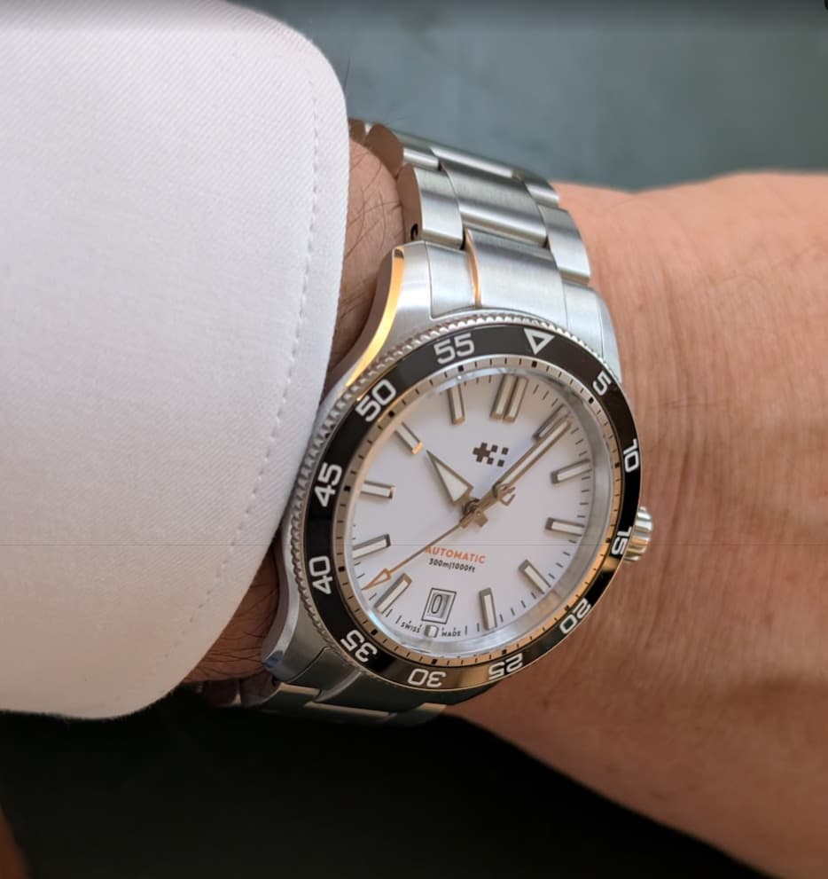 Dat was mij nog niet eens opgevallen. Dat past misschien zo’n horloge toch niet helemaal, zelfs al is hij dressy.