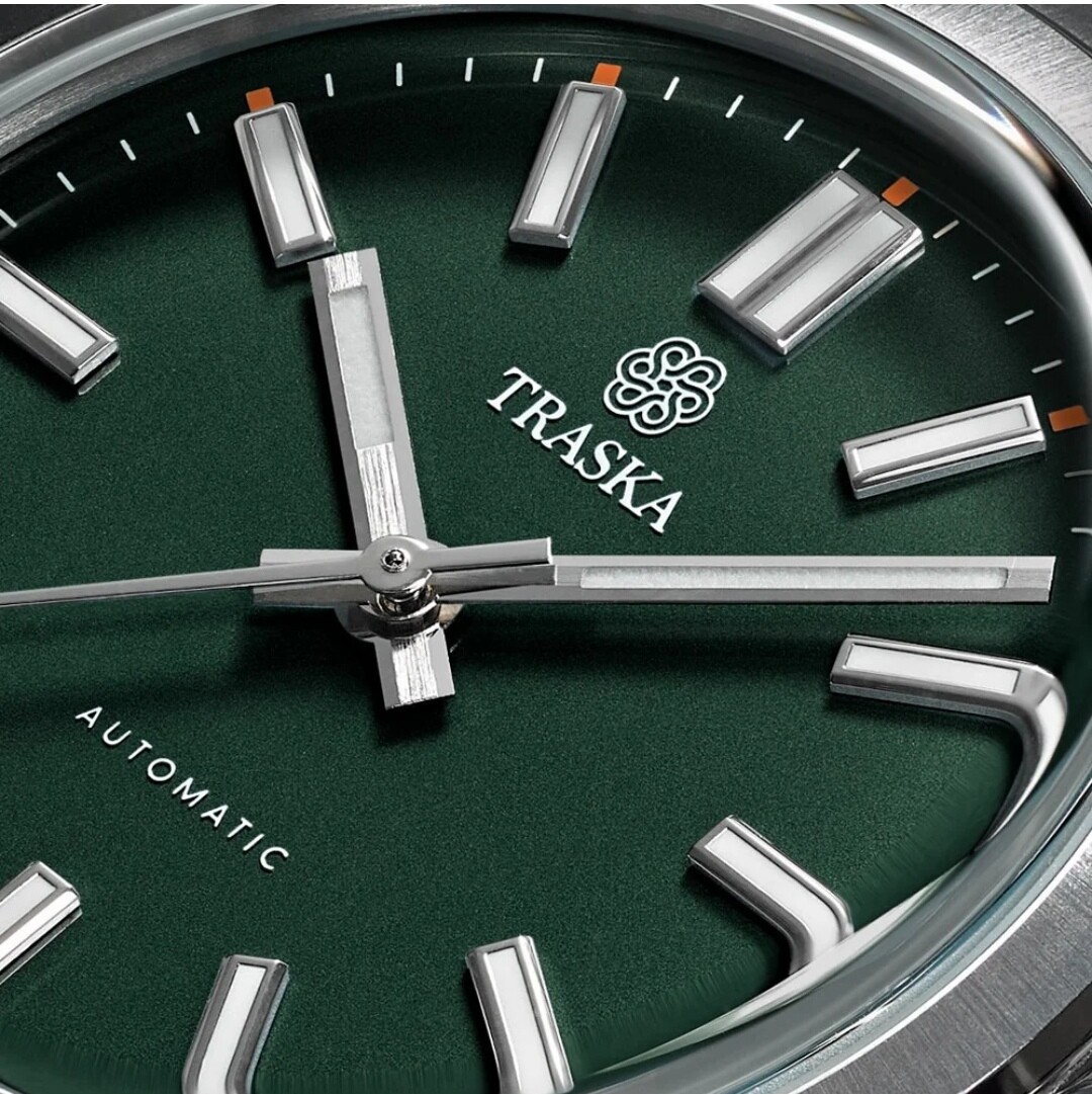 Er zijn tegelijk ook enkele Traska eigen touches, maar daarvoor moet je dieper (willen) duiken (en bij alles dat geen Commuter of Summiteer is speelt dit eigenlijk niet). Het groen vind ik alvast mooier getroffen dan gelijk welke genoemde referentie (klassiek Rolex groen is heller en bij de OP34 is het beduidend geler en een sunburst). Traska’s dubbele marker op 12 vind ik mooier dan de compositie opbreken met een logo, maar misschien missen de markers bij Traska wel wat hoogte. De radiaal geborstelde bezel geeft net wat meer contrast/dynamiek met de wijzerplaat en saffier. De Traska lijkt ook nog 1mm dunner, hoewel de bolle zijkant bij Rolex net wat strakker lijkt te ogen. De wijzers met die geborstelde top zijn in mijn beleving ook net een verbetering tov de middenvouw van het origineel. Natuurlijk hebben we geen hoogwaardig, maar puur een functioneel (en goedkoop te repareren/vervangen) uurwerk in de Traska en ik verwacht van Rolex, al dan niet terecht, een merkbaar hoger afwerkingsniveau. Minder tekst oogt in mijn ogen ook bijna altijd beter. Tenslotte heb je dan nog Traska’s technisch voordeeltje van de harde coating en doorboorde pootjes.