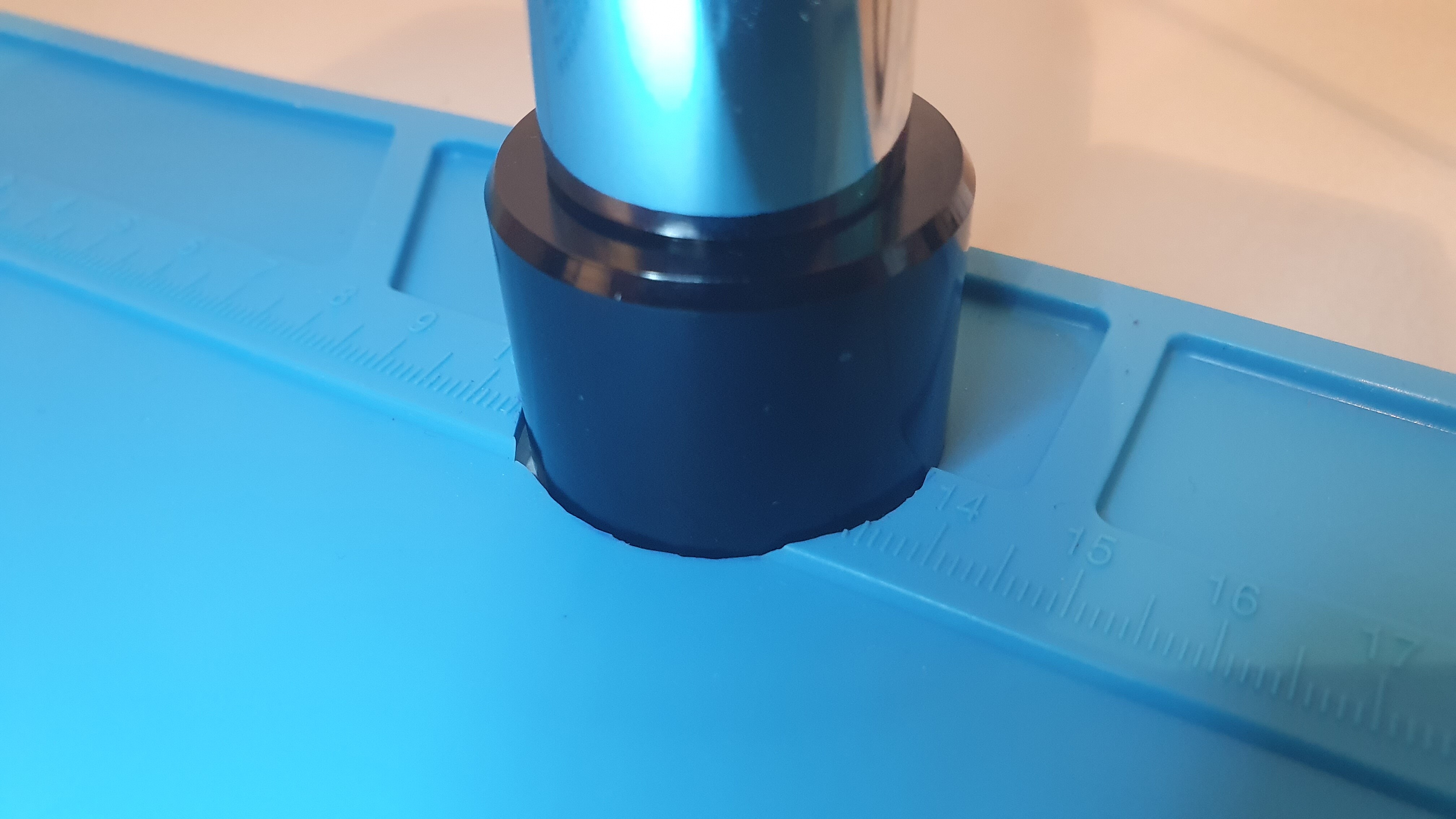Uiteraard was het siliconen matje wel de goeie maat maar er was geen uitsparing voor de stripperpaal waar alles aan zou vast hangen - dat was al op voorhand duidelijk adhv de comments op Aliexpress. Geen probleem, een beetje creatief zijn met een potlood en een scherp mesje en het is ruim netjes. Schoonheidsprijs zit er niet in maar storen doet het niet.