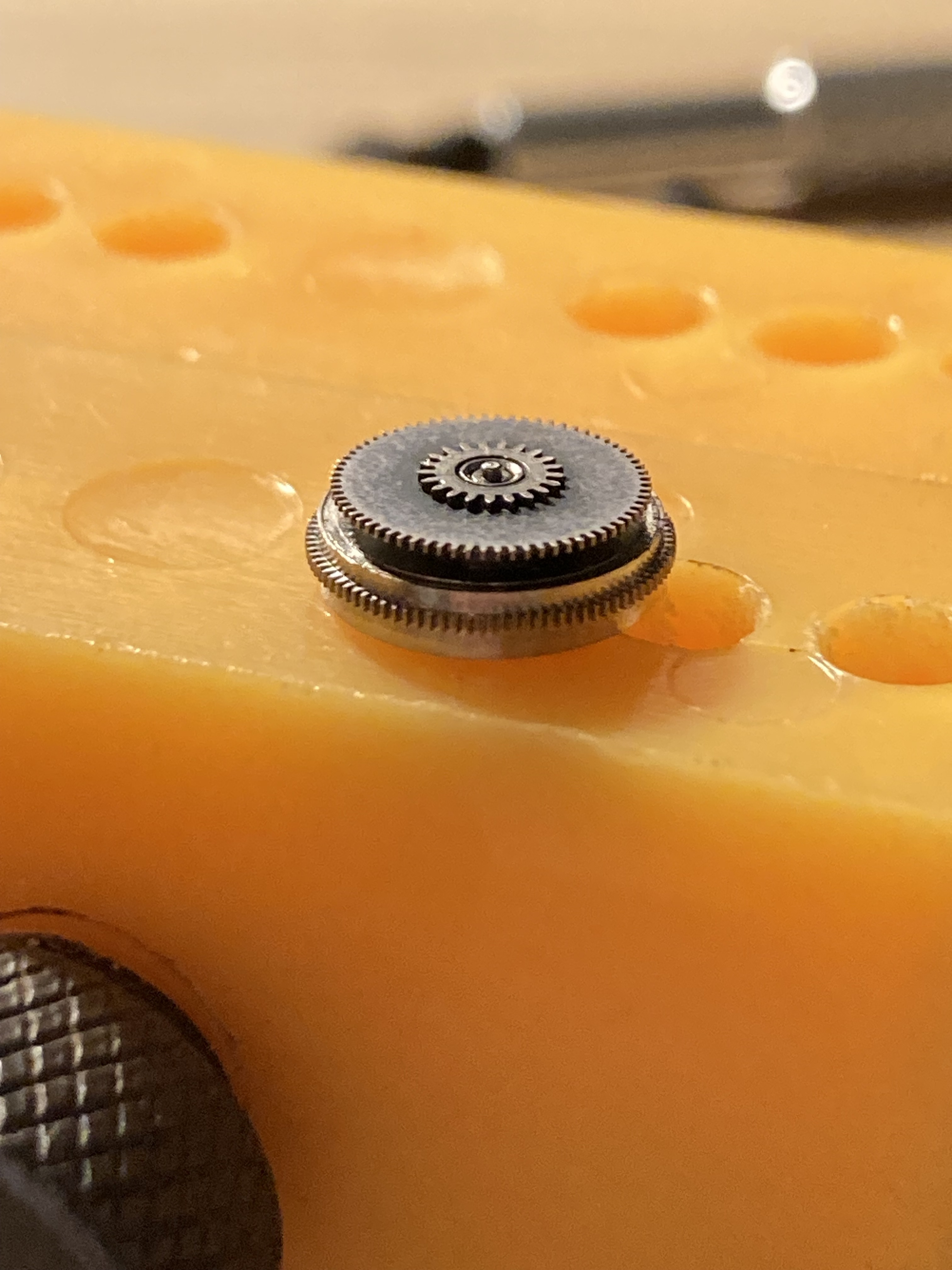 Eenmaal geassembleerd liep het uurwerk goed. Het opwinden van het horloge voelde ook een stuk beter, een betere weerstand en de klikjes van het tonrad klonken ook een stuk steviger. Toen ik alles weer in elkaar had gezet, ontdekte ik een nieuw probleem. Het uurwerk liep goed, maar de wijzers draaiden niet mee. Ook het instellen van de tijd ging zonder enige weerstand. Meestal duidt dit op een losse minuutpijp die zonder frictie op de as van het centrumrad draait, waardoor die slipt en niet door de veerton aangedreven wordt.