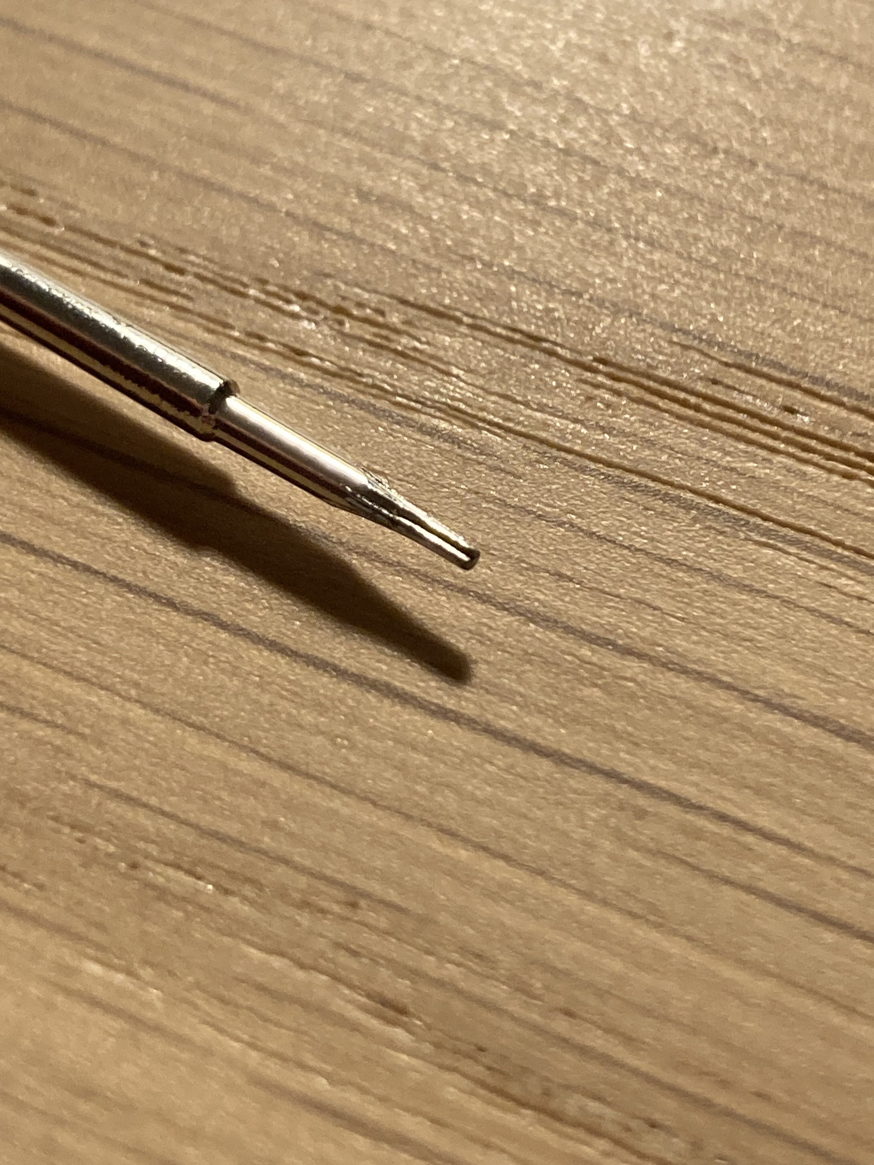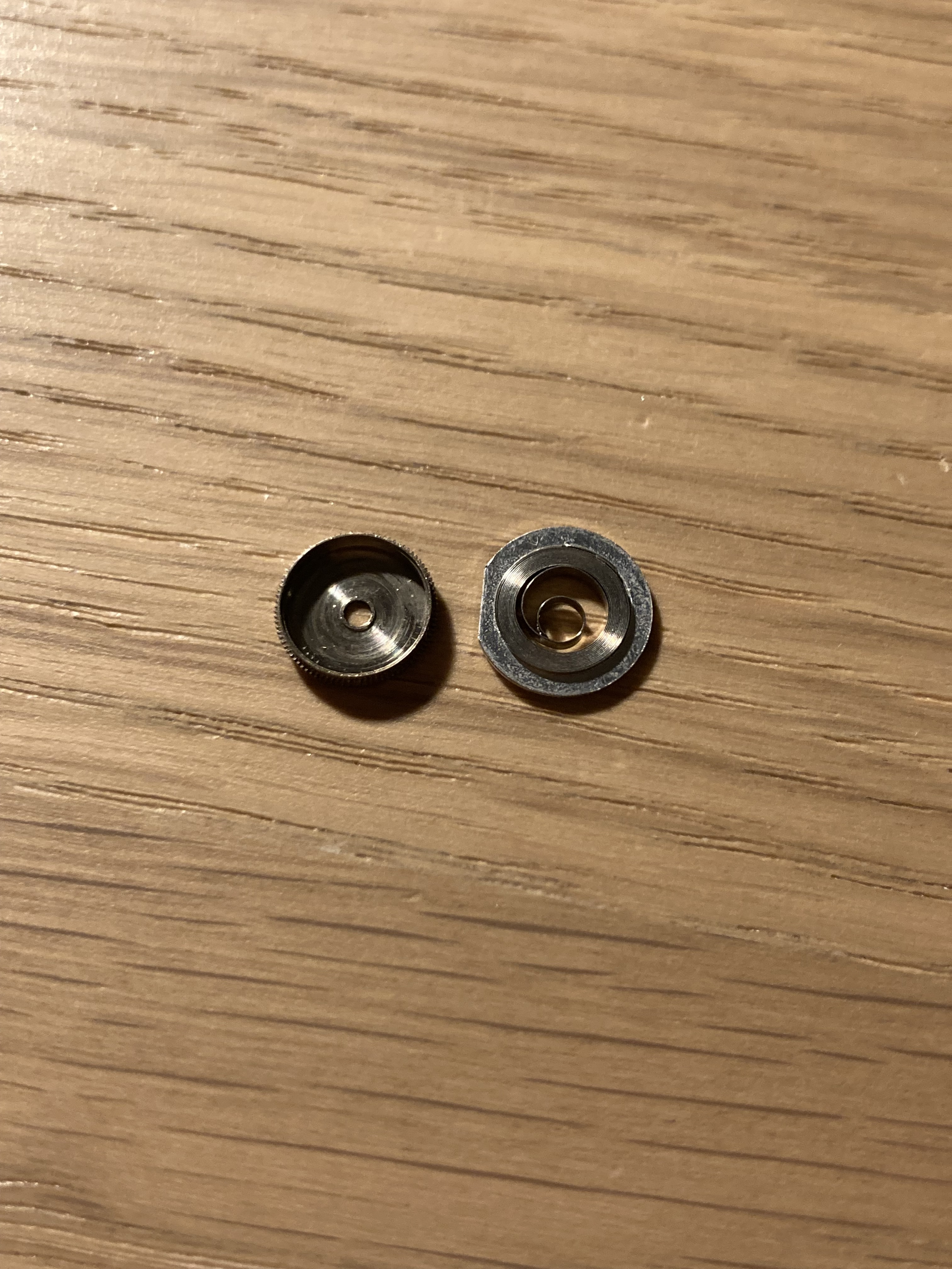 Uiteindelijk met een stuk geïmproviseerd gereedschap (in de vorm van een versleten torx bitje en een hamer) heb ik de bus van de veerton iets uit kunnen zetten dat de frictie weer perfect is, zodat je gemakkelijk de tijd kunt instellen maar er nog genoeg weerstand blijft dat de wijzers mee bewegen met de tijd.