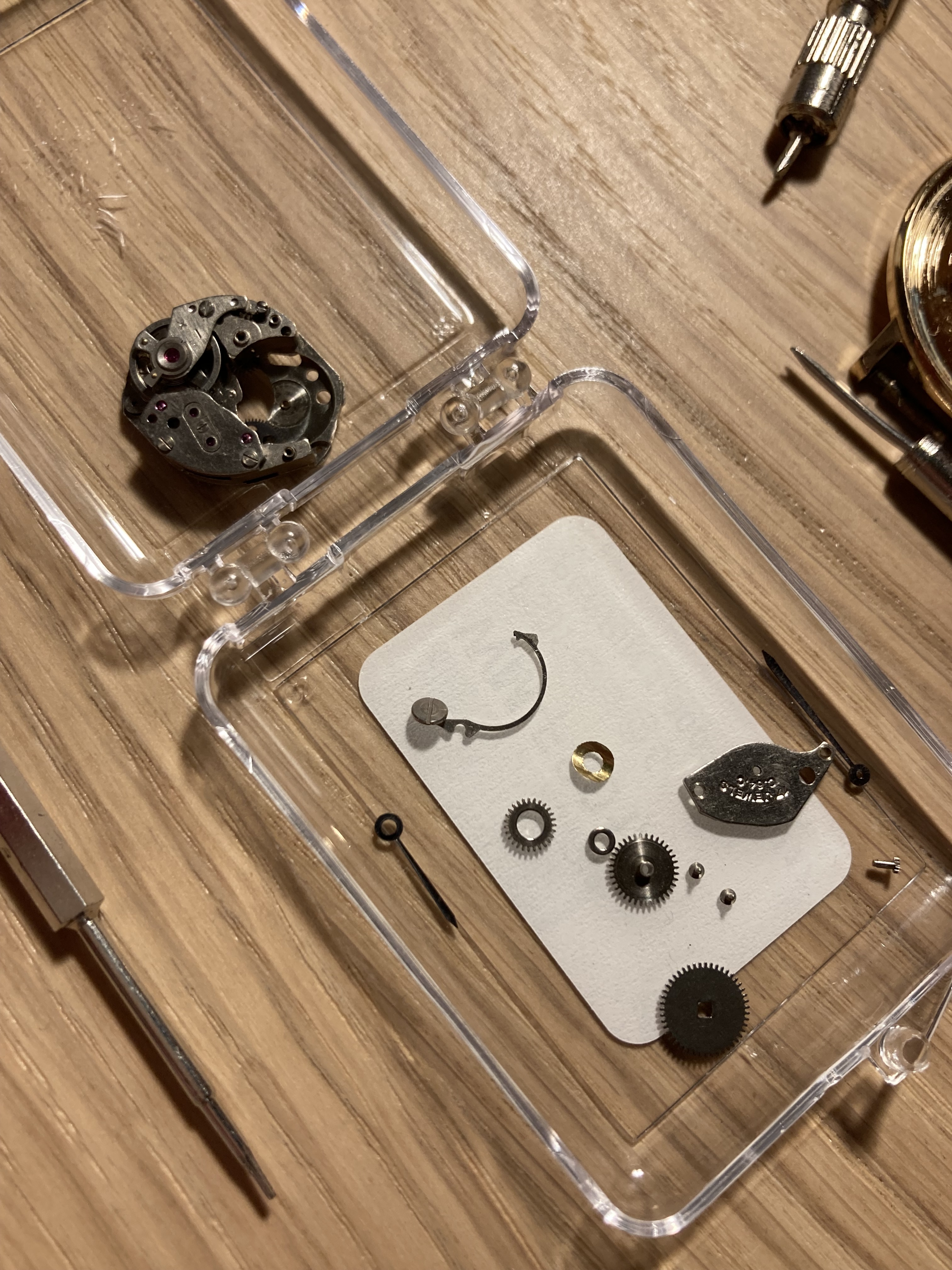 Ik heb al wel eens hier en daar een horloge onder de loep genomen, mijn allereerste reparatie was een simpele Papila Deluxe waarbij het wijzervetzetwerk even op zijn plek gezet moest worden (het renurerad was losgeschoten van de tiretteveer) en later het een Invicta met Sellita SW200 uurwerk waarvan de tiretteveer kapot was.