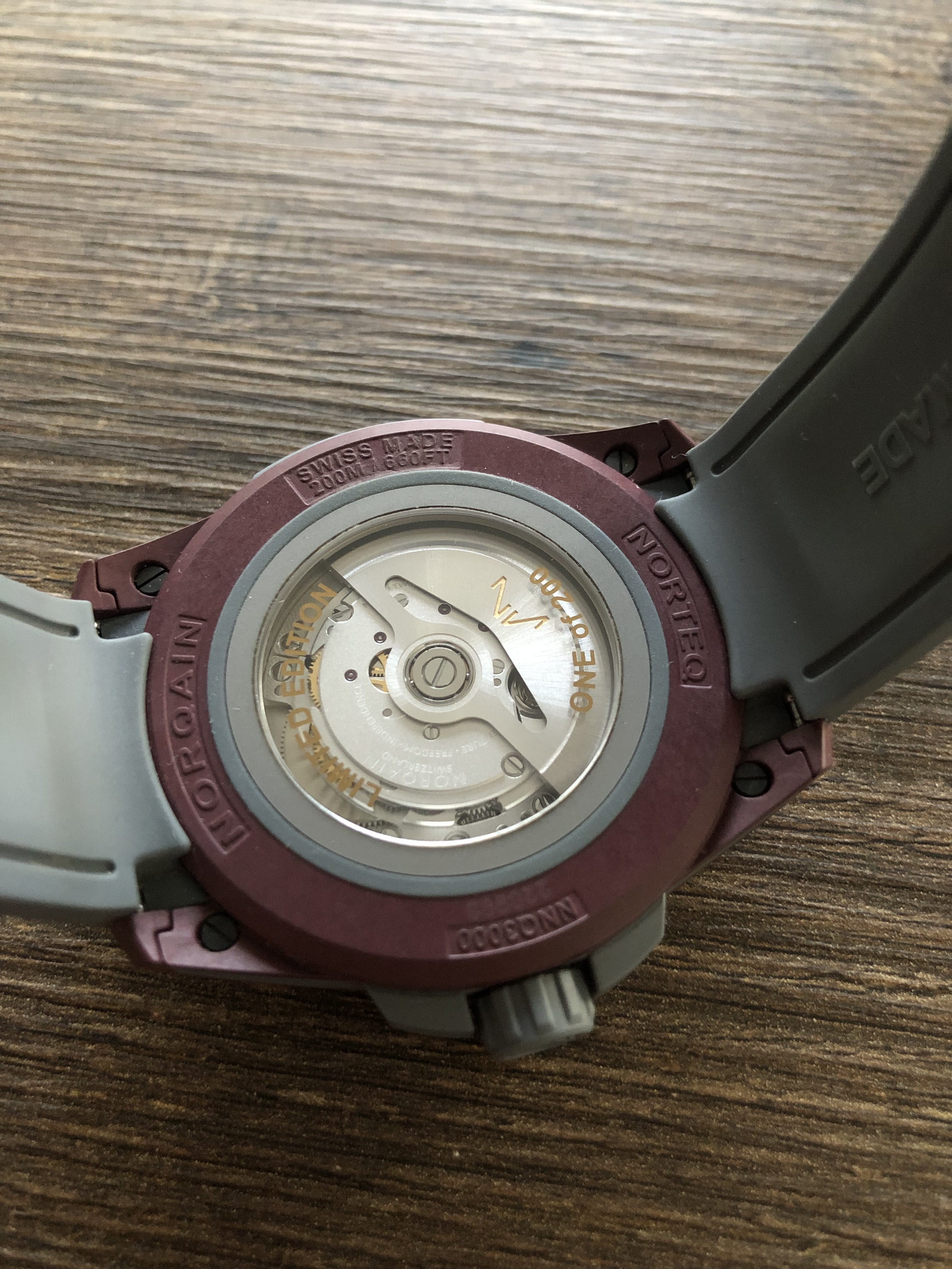 Toen kwam Norqain om de hoek met de nieuwe wild-one serie. Inmiddels uitgebreid naar meerdere kleuren (en binnenkort nog meer), waren er destijds 4. Waarvan er toch 1 wel erg opviel: grijs met bordeauxrood… niet een alledaagse combinatie (speciaal/anders ).