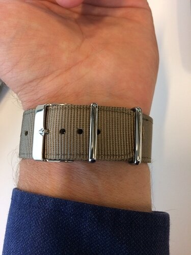 Yep, hier net zo. Standaard bandjes zijn altijd maar net lang genoeg, en de gesp zit dan altijd te ver naar rechts, in plaats van recht onder de pols. Bij standaard lengte NATOs zijn het ook altijd meer ‘gewone’ banden; terugvouwen en -steken is er niet bij.