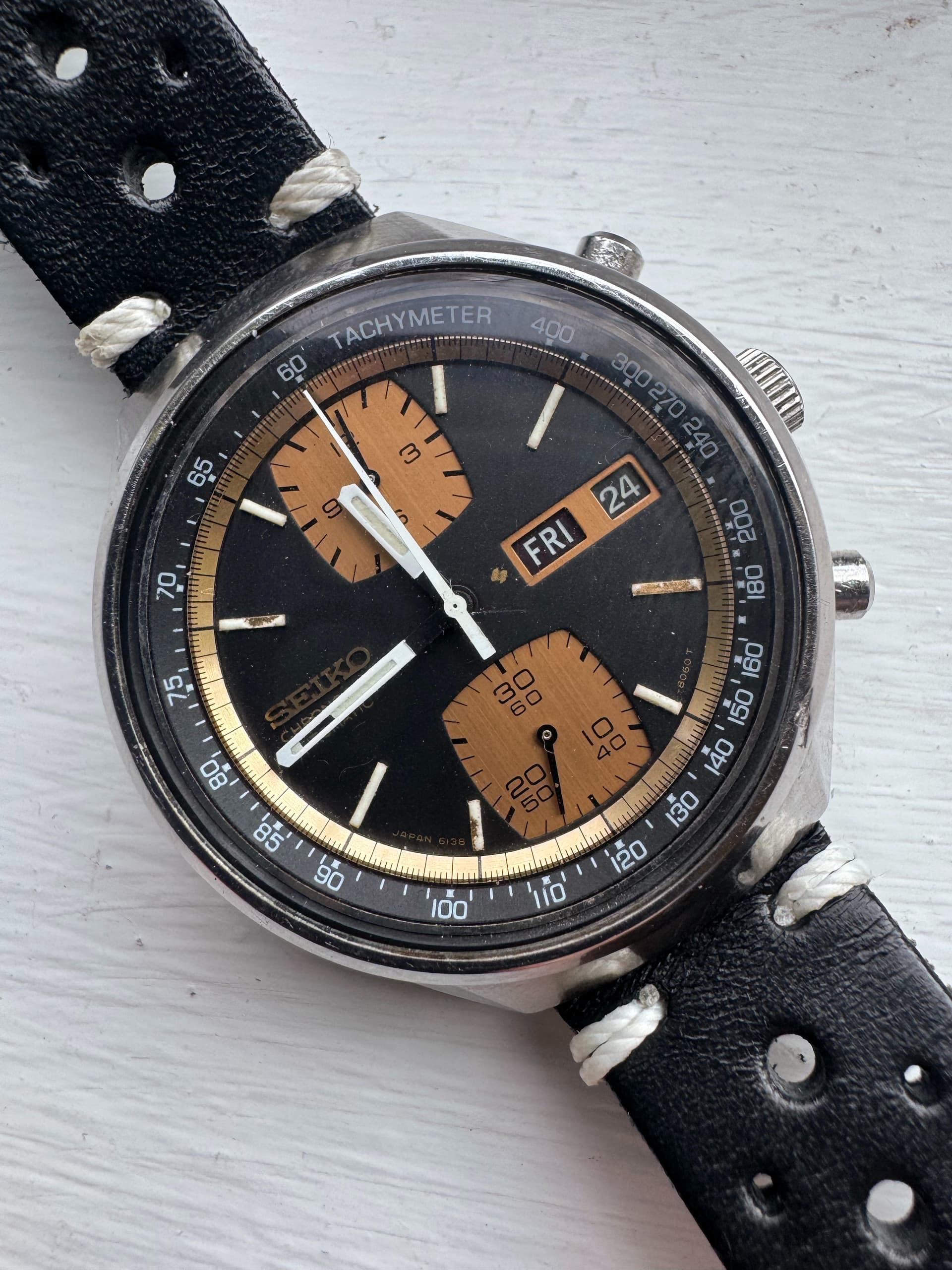 Deze chrono is uit mijn geboortemaand. Heb er behoorlijk wat voor betaald, maar hij werd echt “van mij” toen ik z’n glas heel mooi had gepolijst. Heb hem nog niet zelf geserviced, dat lijkt mij best eng, maar draag hem graag en hij gaat zeker nooit meer weg. Bijna 55 jaar oud, en veel gedragen. Iemand heeft de lume op de indices bijgeschilderd, ze hebben daardoor een verschillende helderheid in het donker, heel grappig. Een verleden, maar toch nog heel toonbaar en perfect werkend.