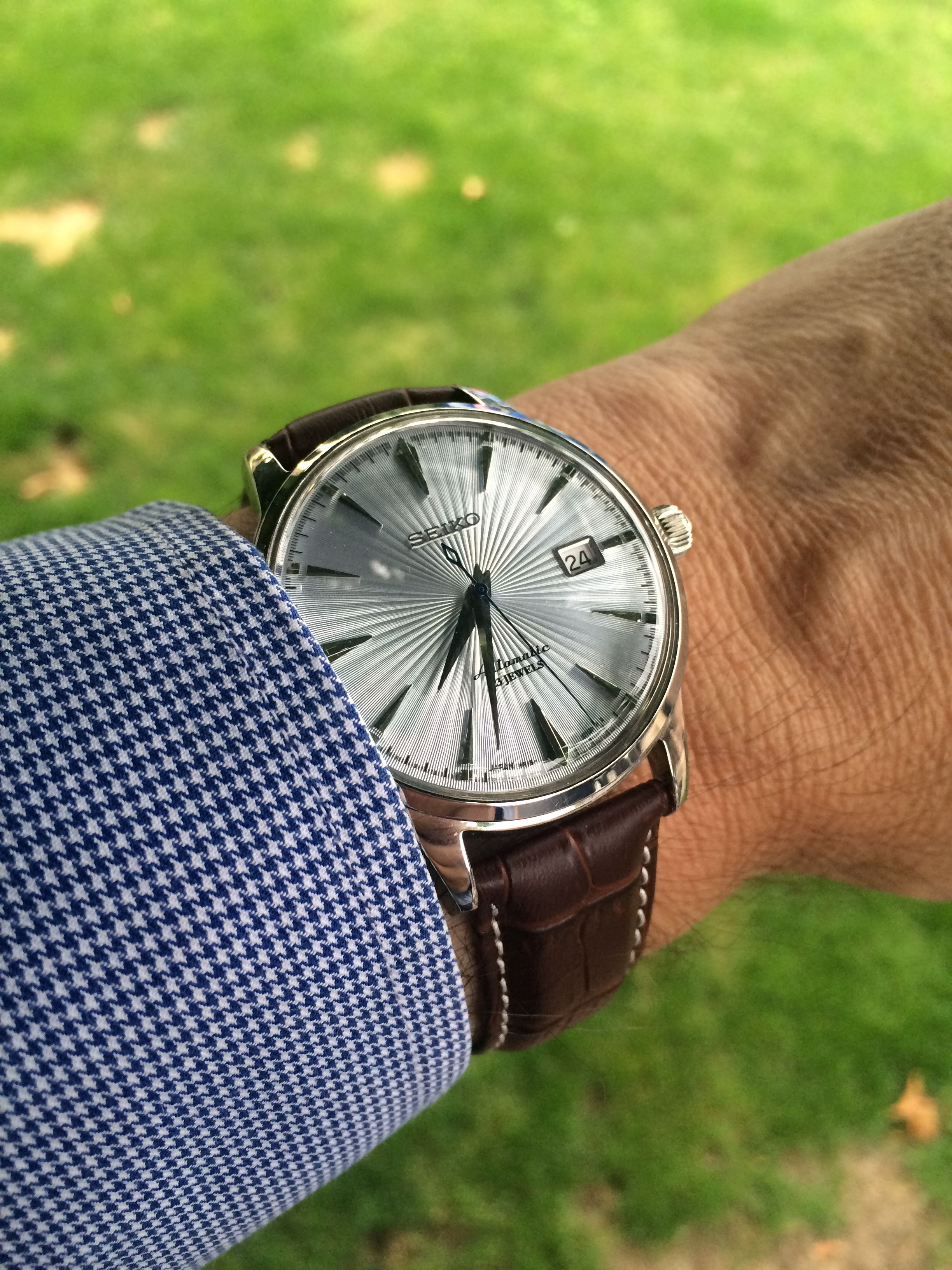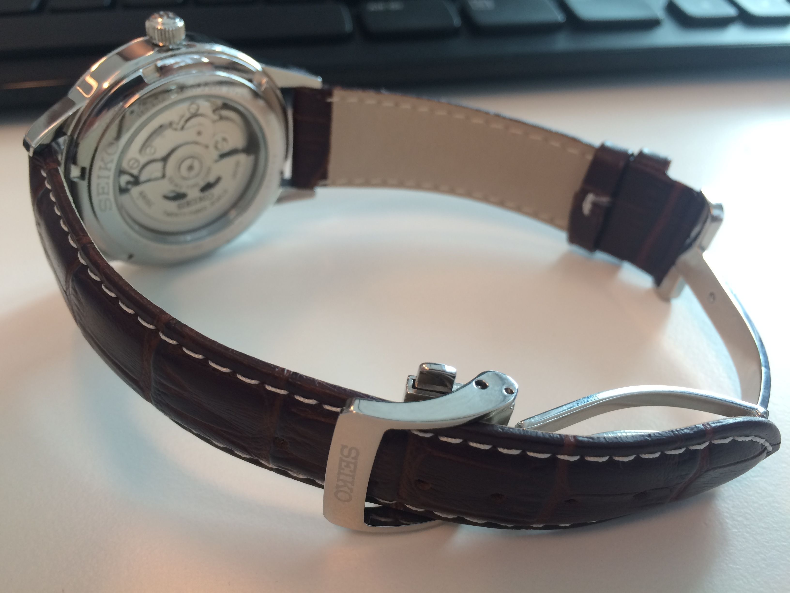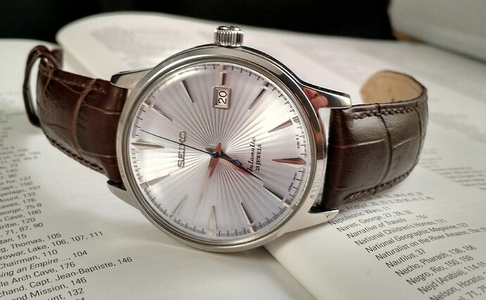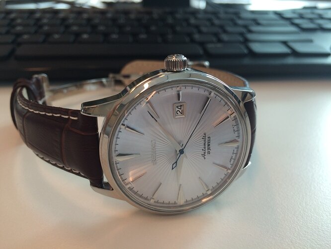 Bij de deal ook een paar alternatieve horlogebandjes meem mogen nemen, omdat de standaard bijgeleverde band niet echt is om over naar huis te schrijven. De Cocktail heeft nu een mooie bruine croco-grain met witte stiksels en de originele vouwsluiting (erg prettig!). Ik ga nog wel op zoek naar een alternatief, zwart of bruin croco maar dan zonder de witte stiksels. Zal waarschijnlijk iets van een Hirsch Duke worden maar sta open voor suggesties!