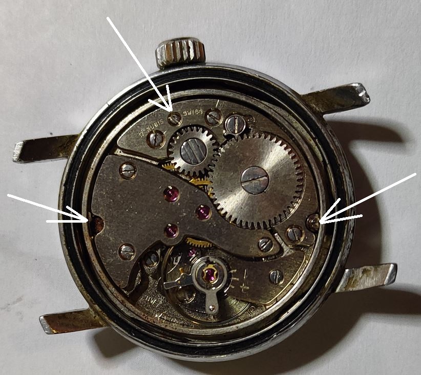 Dat gezegd hebbende zou de tiretteschroef aan de kant van de kroon moeten zitten. Zonder dit uurwerk te kennen zou ik TS niet kunnen helpen met de vraag waar. Ik zit nu met een Chinese Unitas-kloon te rommelen waar hij aan de achterkant zit, het zou het kleinste of grootste schroefje op de brug naast de kroon kunnen zijn, maar er zou ook een palletje kunnen zijn om de kroon los te krijgen. De foto van TS is slecht. Ik zou een betere foto proberen te posten.